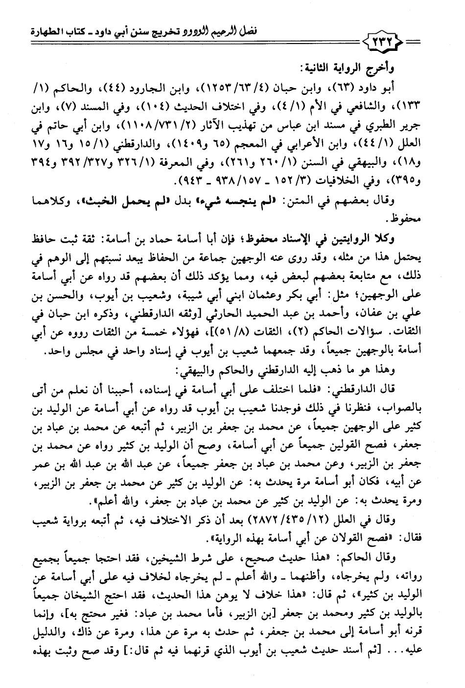 أبو داود (٦٣)، وابن حبان (٤/ ٦٣/ ١٢٥٣)، وابن الجارود (٤٤)، والحاكم (١/ ١٣٣)، والشافعي في الأم (١/ ٤)، وفي اختلاف الحديث (١٠٤)، وفي المسند (٧)، وابن جرير الطبري في مسند ابن عباس من تهذيب الآثار (٢/ ٧٣١ / ١١٠٨)، وابن أبي حاتم في العلل (١/ ٤٤)، وابن الأعرابي في المعجم (٦٥ و ١٤٠٩)، والدارقطني (١/ ١٥ و ١٦ و ١٧ و ١٨)، والبيهقي في السنن (١/ ٢٦٠ و ٢٦١)، وفي المعرفة (١/ ٣٢٦ و ٣٢٧/ ٣٩٢ و ٣٩٤ و ٣٩٥)، وفي الخلافيات (٣/ ١٥٢ - ١٥٧/ ٩٣٨ - ٩٤٣).