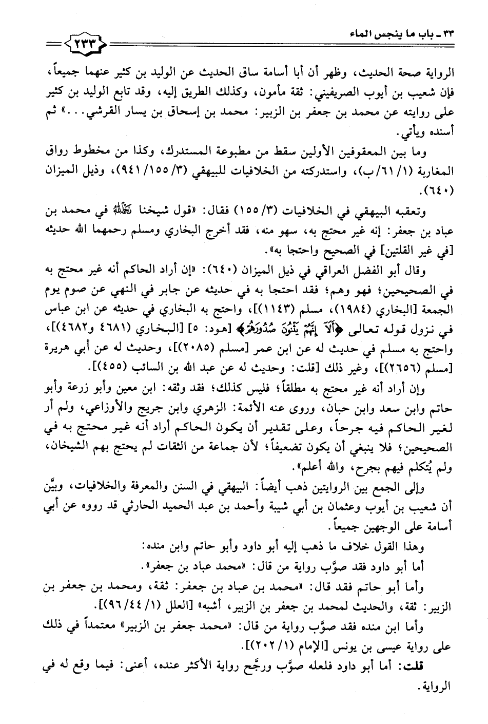 وتعقبه البيهقي في الخلافيات (٣/ ١٥٥) فقال: "قول شيخناء - رحمه اللهُ - في محمد بن عباد بن جعفر: إنه غير محتج به، سهو منه، فقد أخرج البخاري ومسلم رحمهما الله حديثه [في غير القلتين] في الصحيح واحتجا به".
