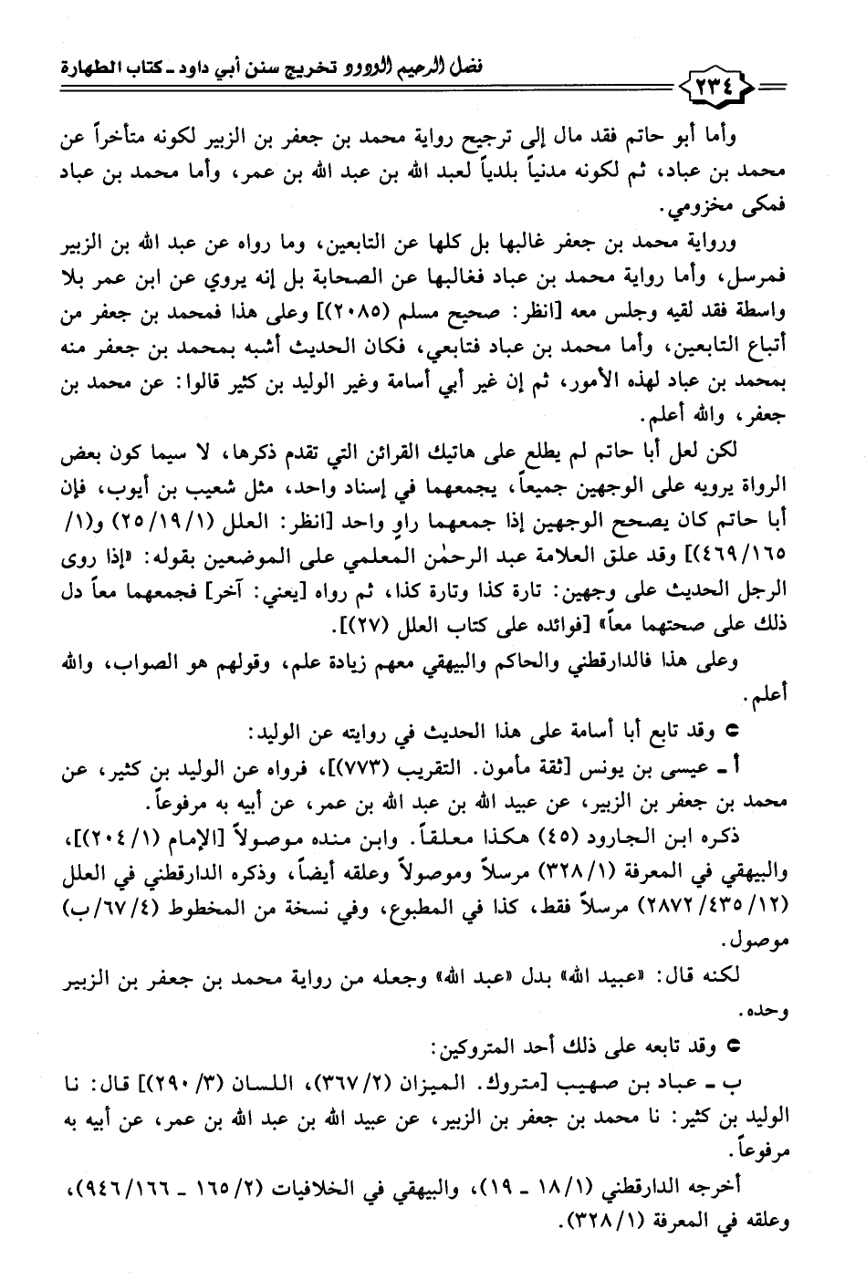 أما أبو حاتم فقد مال إلى ترجيح رواية محمد بن جعفر بن الزبير لكونه متأخرًا عن محمد بن عباد، ثم لكونه مدنيًّا بلديًّا لعبد الله بن عبد الله بن عمر، وأما محمد بن عباد فمكي مخزومي.