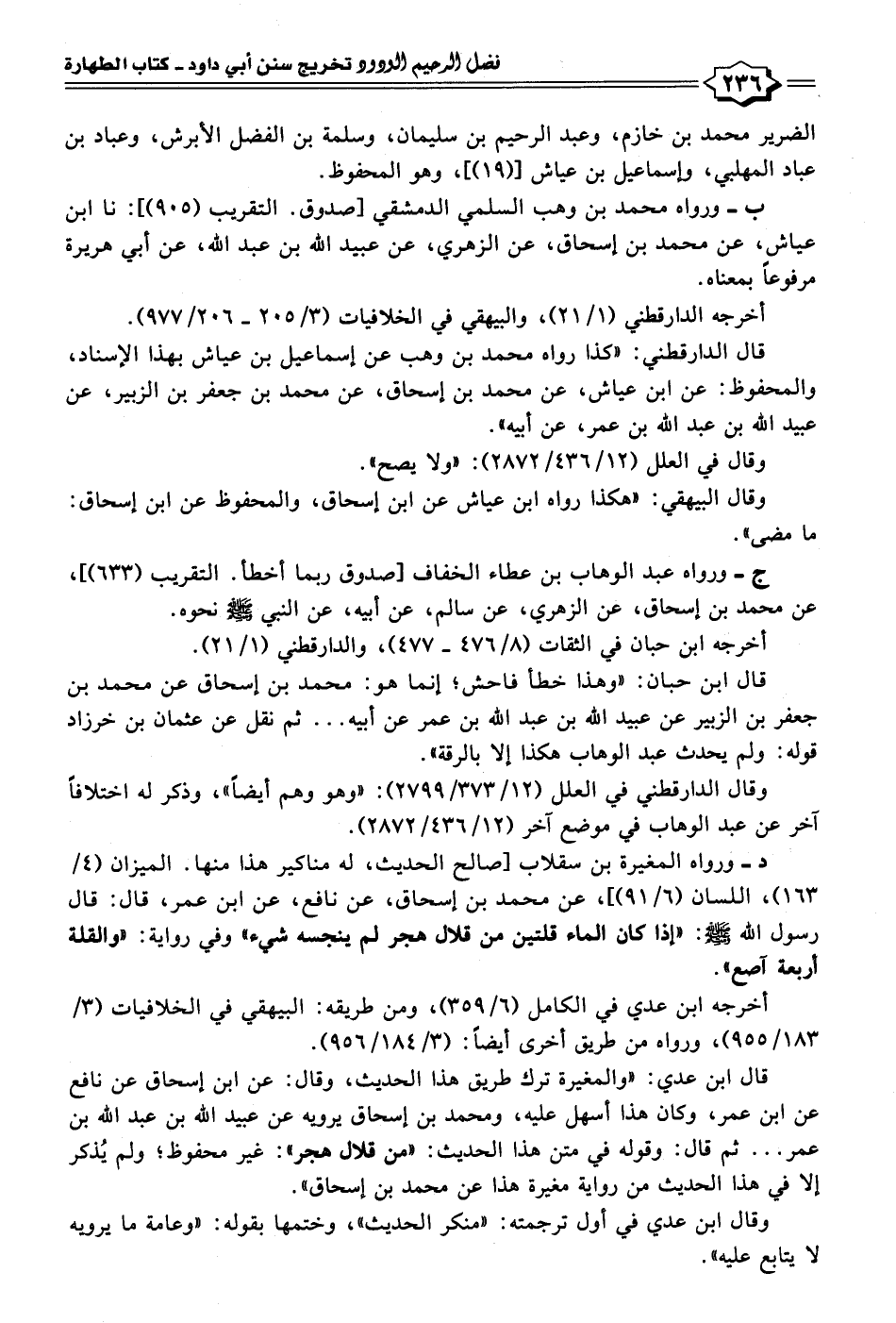 د - ورواه المغيرة بن سقلاب [صالح الحديث، له مناكير هذا منها. الميزان (٤/ ١٦٣)، اللسان (٦/ ٩١)]، عن محمد بن إسحاق، عن نافع، عن ابن عمر، قال: قال رسول الله - صلى الله عليه وسلم -: "إذا كان الماء قلتين من قلال هجر لم ينجسه شيء" وفي رواية: "والقلة أربعة آصع".