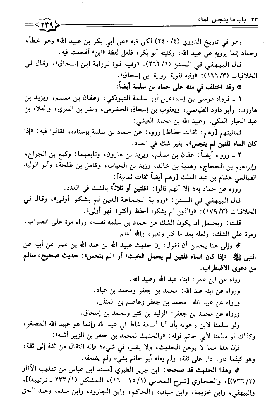 وإلى هنا يحسن أن نقول: إن حديث عبيد الله بن عبد الله بن عمر عن أبيه عن النبي - صلى الله عليه وسلم -: "إذا كان الماء قلتين لم يحمل الخبث أو "لم ينجس": حديث صحيح، سالم من دعوى الاضطراب.
