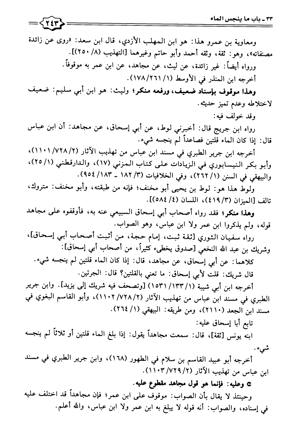 رواه ابن جريج قال: أخبرني لوط، عن أبي إسحاق، عن مجاهد: أن ابن عباس قال: إذا كان الماء قلتين فصاعدًا لم ينجسه شيء.
