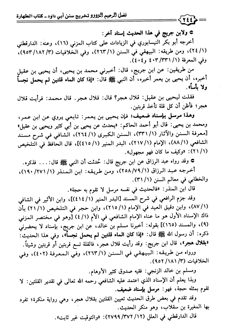 وبذا يعلم أن الإسناد الَّذي اعتمد عليه الشافعي رحمه الله تعالى في تقدير القلتين: لا تقوم بمثله حجة، فهو: مرسل بإسناد ضعيف.