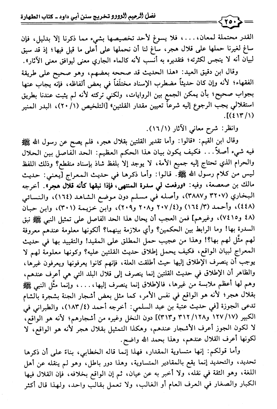 وقال ابن القيم: "قالوا: وأما تقدير القلتين بقلال هجر، فلم يصح عن رسول الله - صلى الله عليه وسلم - فيه شيء أصلًا ... فكيف يكون كان هذا الحكم العظيم: الحد الفاصل بين الحلال والحرام الَّذي تحتاج إليه جميع الأمة، لا يوجد إلا بلفظ شاذ بإسناد منقطع؟ وذلك اللفظ ليس من كلام رسول الله - صلى الله عليه وسلم -. قالوا: وأما ذكرها في حديث المعراج [يعني: حديث مالك بن صعصعة، وفيه: [ورفعت في سدرة المنتهى، فإذا نبقها كأنه قلال هجر". أخرجه البخاري (٣٢٠٧ و ٣٨٨٧)، وأصله في مسلم دون موضع الشاهد (١٦٤)، والنسائي (٤٤٨)، وأحمد (٣/ ١٦٤) و (٤/ ٢٠٧ و ٢٠٨ و ٢٠٩)، وابن خزيمة (٣٠١)، وابن حبان (٤٨ و ٧٤١٥)، وغيرهم، فمن العجب أن يحال هذا الحد الفاصل على تمثيل النبي - صلى الله عليه وسلم - نبق السدرة بها! وما الرابط بين الحكمين؟ وأي ملازمة بينهما؟ ألكونها معلومة عندهم معروفة لهم مثل لهم بها؟! وهذا من عجيب حمل المطلق على المقيد؟ والتقييد بها في حديث المعراج لبيان الواقع، فكيف يحمل إطلاق حديث القلتين عليه؛ وكونها معلومة لهم لا يوجب أن ينصرف الإطلاق إليها حيث أطلقت العلة، فإنهم كانوا يعرفونها ويعرفون غيرها، والظاهر أن الإطلاق في حديث القلتين إنما ينصرف إلى قلال البلد التي هي أعرف عندهم، وهم لها أعظم ملابسة من غيرها، فالإطلاق إنما ينصرف إليها، ... ، وإنما مثَّل النبي - صلى الله عليه وسلم - بقلال هجر؛ لأنَّه هو الواقع في نفس الأمر، كما مثل بعض أشجار الجنّة بشجرة بالشام تدعى الجوزة [في حديث عتبة بن عبد السلمي: أخرجه أحمد (٤/ ١٨٣)، والطبراني في الكبير (١٧/ ١٢٧ و ١٢٨/ ٣١٢ و ٣١٣)] دون النخل وغيره من أشجارهم؛ لأنَّه هو الواقع، لا لكون الجوز أعرف الأشجار عندهم، وهكذا التمثيل بقلال هجر لأنَّه هو الواقع، لا لكونها أعرف القلال عندهم، وهذا بحمد الله واضح.