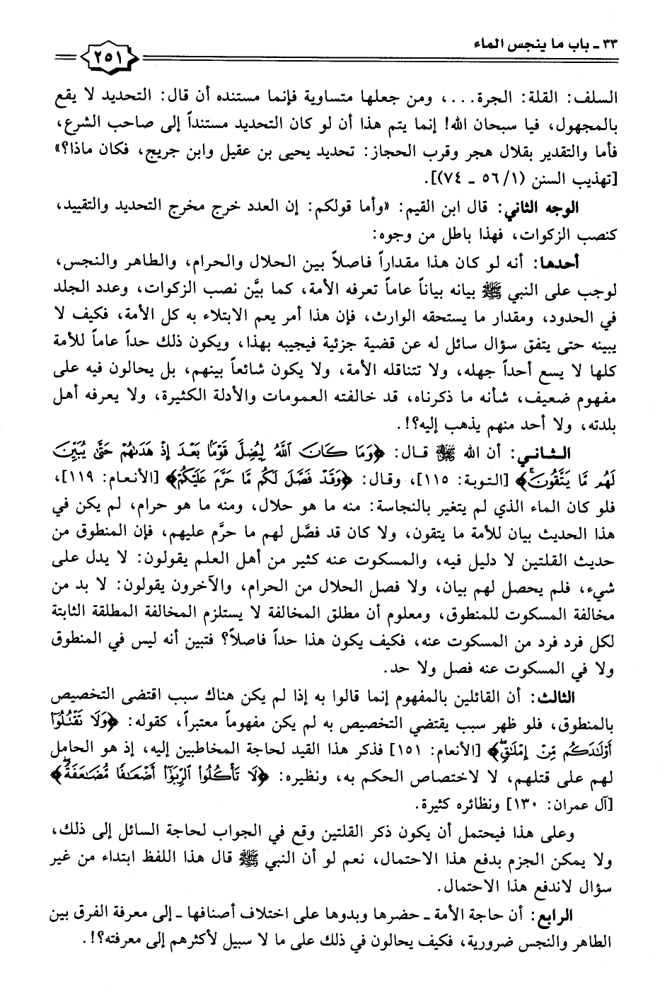 الثاني: أن الله سبحانه وتعالى قال: {وَمَا كَانَ اللَّهُ لِيُضِلَّ قَوْمًا بَعْدَ إِذْ هَدَاهُمْ حَتَّى يُبَيِّنَ لَهُمْ مَا يَتَّقُونَ} [التوبة: ١١٥]، وقال: {وَقَدْ فَصَّلَ لَكُمْ مَا حَرَّمَ عَلَيْكُمْ} [الأنعام: ١١٩]، فلو كان الماء الذي لم يتغير بالنجاسة: منه ما هو حلال، ومنه ما هو حرام، لم يكن في هذا الحديث بيان للأمة ما يتقون، ولا كان قد فصَّل لهم ما حرَّم عليهم، فإن المنطوق من حديث القلتين لا دليل فيه، والمسكوت عنه كثير من أهل العلم يقولون: لا يدل على شيء، فلم يحصل لهم بيان، ولا فصل الحلال من الحرام، والآخرون يقولون: لا بد من مخالفة المسكوت للمنطوق، ومعلوم أن مطلق المخالفة لا يستلزم المخالفة المطلقة الثابتة لكل فرد فرد من المسكوت عنه، فكيف يكون هذا حدًا فاصلًا؟ فتبين أنه ليس في المنطوق ولا في المسكوت عنه فصل ولا حد.