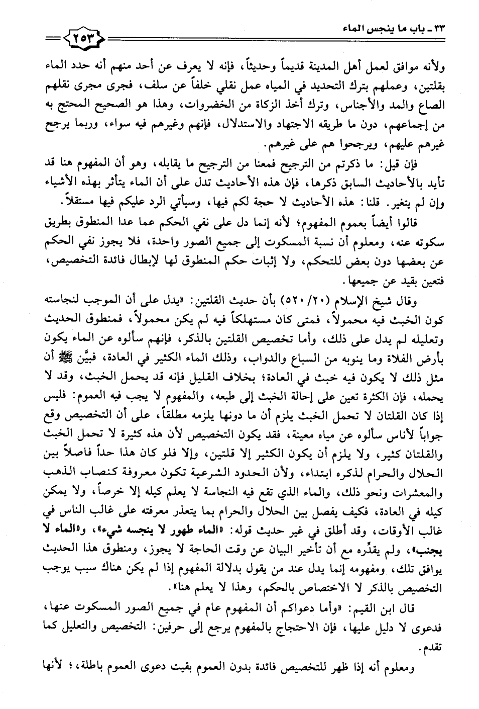 وقال شيخ الإسلام (٢٠/ ٥٢٥) بأن حديث القلتين: "يدل على أن الموجب لنجاسته كون الخبث فيه محمولًا، فمتى كان مستهلكًا فيه لم يكن محمولًا، فمنطوق الحديث وتعليله لم يدل على ذلك، وأما تخصيص القلتين بالذكر، فإنهم سألوه عن الماء يكون بأرض الفلاة وما ينوبه من السباع والدواب، وذلك الماء الكثير في العادة، فبيَّن - صلى الله عليه وسلم - أن مثل ذلك لا يكون فيه خبث في العادة؛ بخلاف القليل فإنه قد يحمل الخبث، وقد لا يحمله، فإن الكثرة تعين على إحالة الخبث إلى طبعه، والمفهوم لا يجب فيه العموم: فليس إذا كان القلتان لا تحمل الخبث يلزم أن ما دونها يلزمه مطلقًا، على أن التخصيص وقع جوابًا لأناس سألوه عن مياه معينة، فقد يكون التخصيص لأن هذه كثيرة لا تحمل الخبث والقلتان كثير، ولا يلزم أن يكون الكثير إلا قلتين، وإلا فلو كان هذا حدًا فاصلًا بين الحلال والحرام لذكره ابتداء، ولأن الحدود الشرعية تكون معروفة كنصاب الذهب والمعشرات ونحو ذلك، والماء الذي تقع فيه النجاسة لا يعلم كيله إلا خرصًا، ولا يمكن كيله في العادة، فكيف يفصل بين الحلال والحرام بما يتعذر معرفته على غالب الناس في غالب الأوقات، وقد أطلق في غير حديث قوله: "الماء طهور لا ينجسه شيء"، و"الماء لا يجنب"، ولم يقدِّره مع أن تأخير البيان عن وقت الحاجة لا يجوز، ومنطوق هذا الحديث يوافق تلك، ومفهومه إنما يدل عند من يقول بدلالة المفهوم إذا لم يكن هناك سبب يوجب التخصيص بالذكر لا الاختصاص بالحكم، وهذا لا يعلم هنا".