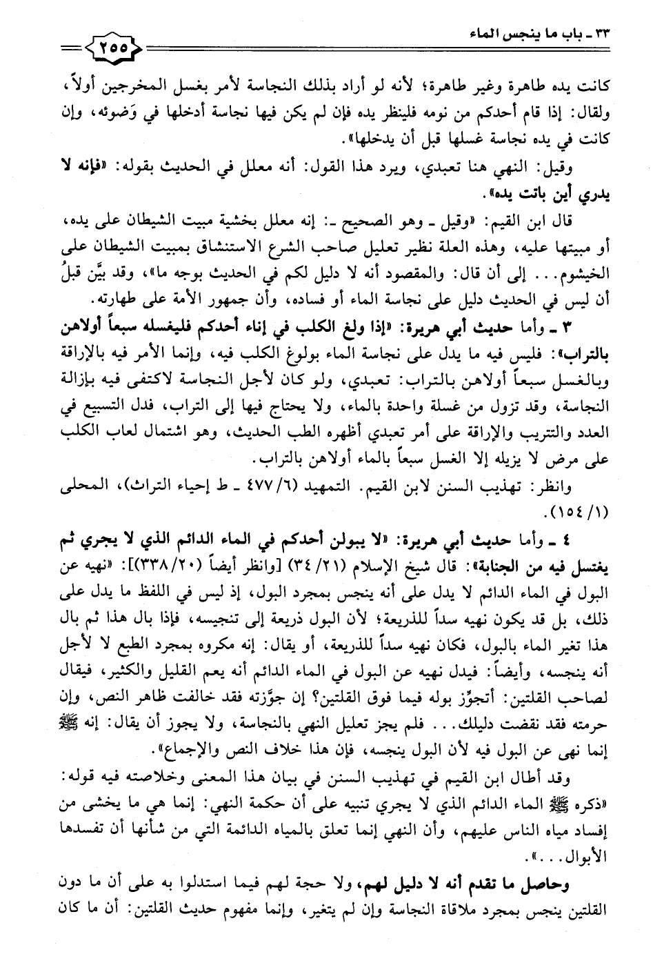 ٤ - وأما حديث أبو هريرة: "لا يبولن أحدكم في الماء الدائم الذي لا يجري ثم يغتسل فيه من الجنابة": قال شيخ الإسلام (٢١/ ٣٤) [وانظر أيضًا (٢٠/ ٣٣٨)]: "نهيه عن البول في الماء الدائم لا يدل على أنه ينجس بمجرد البول، إذ ليس في اللفظ ما يدل على ذلك، بل قد يكون نهيه سدًا للذريعة؛ لأن البول ذريعة إلى تنجيسه، فإذا بال هذا ثم بال هذا تغير الماء بالبول، فكان نهيه سدًا للذريعة، أو يقال: إنه مكروه بمجرد الطبع لا لأجل أنه ينجسه، وأيضًا: فيدل نهيه عن البول في الماء الدائم أنه يعم القليل والكثير، فيقال لصاحب القلتين: أتجوِّز بوله فيما فوق القلتين؟ إن جوَّزته فقد خالفت ظاهر النص، وإن حرمته فقد نقضت دليلك ... فلم يجز تعليل النهي بالنجاسة، ولا يجوز أن يقال: إنه - صلى الله عليه وسلم - إنما نهى عن البول فيه لأن البول ينجسه، فإن هذا خلاف النص والإجماع".