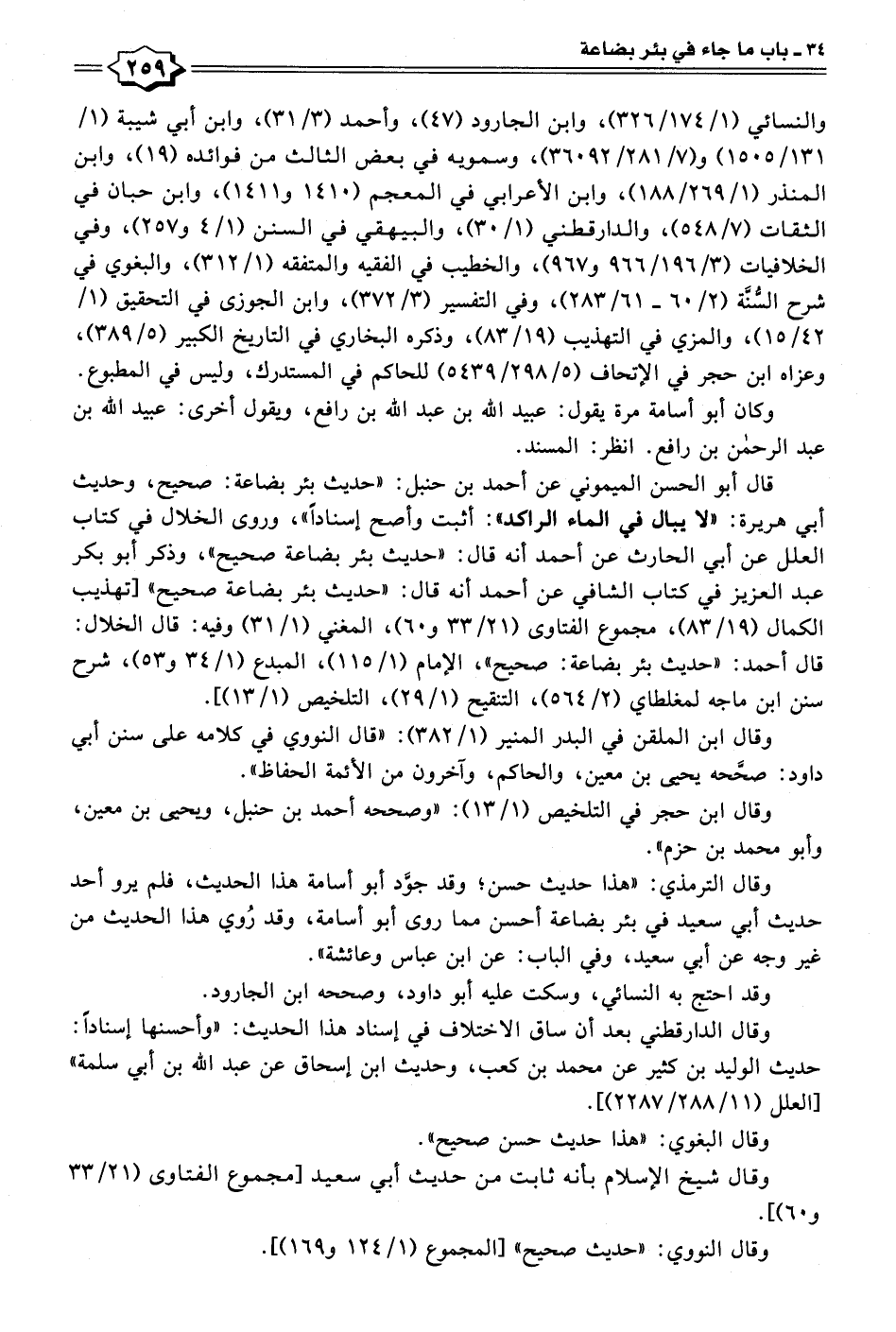 وقال الترمذي: "هذا حديث حسن؛ وقد جوَّد أبو أسامة هذا الحديث، فلم يرو أحد حديث أبي سعيد في بئر بضاعة أحسن مما روى أبو أسامة، وقد رُوي هذا الحديث من غير وجه عن أبي سعيد، وفي الباب: عن ابن عباس وعائشة".