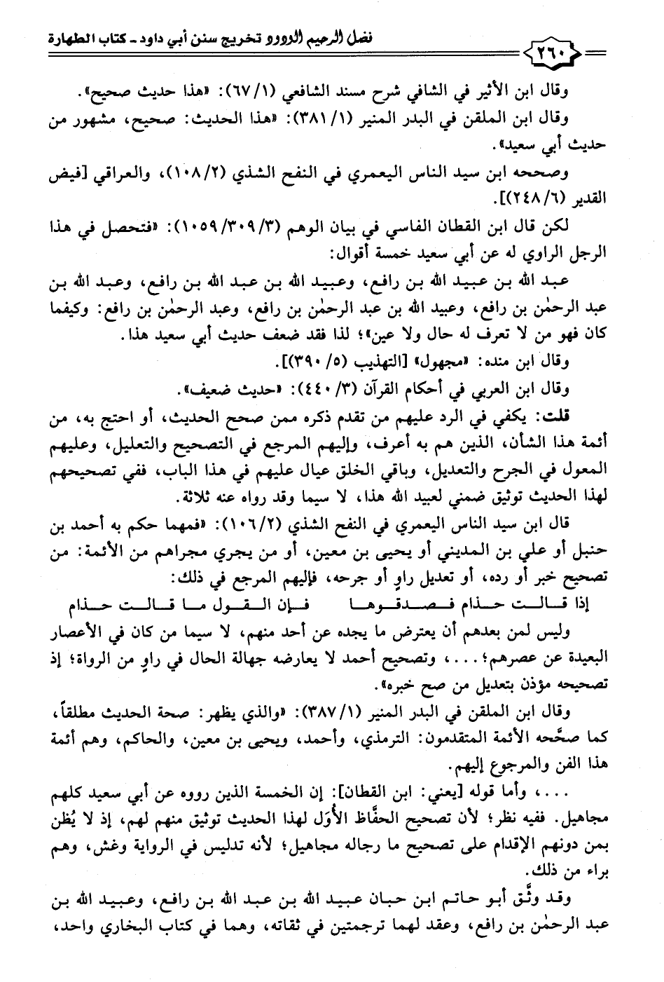 عبد الله بن عبيد الله بن رافع، وعبيد الله بن عبد الله بن رافع، وعبد الله بن عبد الرحمن بن رافع، وعبيد الله بن عبد الرحمن بن رافع، وعبد الرحمن بن رافع: وكيفما كان فهو من لا تعرف له حال ولا عين"؛ لذا فقد ضعف حديث أبي سعيد هذا.