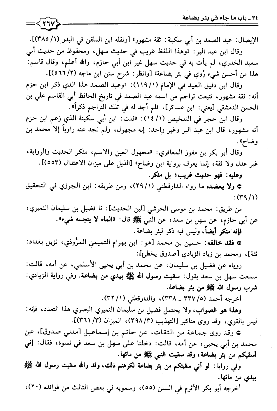 وقال ابن عبد البر: "وهذا اللفظ كريب في حديث سهل، ومحفوظ من حديث أبي سعيد الخدري، لم يأت به في حديث سهل غير ابن أبي حازم، والله أعلم، وقال قاسم: هذا من أحسن شيء رُوي في بئر بضاعة" [وانظر: شرح سنن ابن ماجه (٢/ ٥٦٦)].