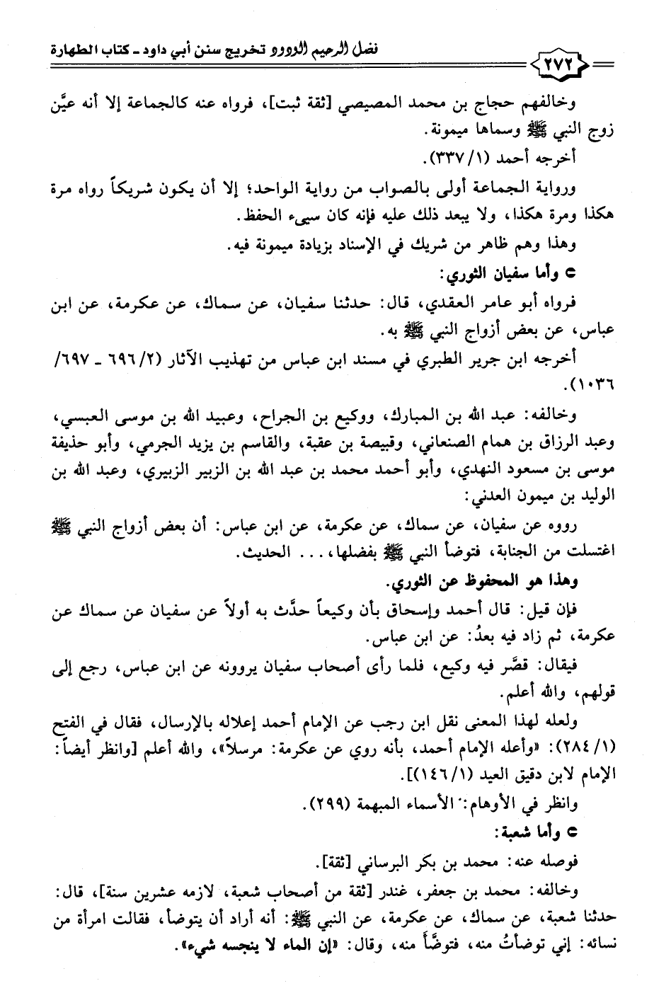 وخالفه: محمد بن جعفر، غندر [ثقة من أصحاب شعبة، لازمه عشرين سنة]، قال: حدثنا شعبة، عن سماك، عن عكرمة، عن النبي - صلى الله عليه وسلم -: أنه أراد أن يتوضأ، فقالت امرأة من نسائه: إني توضأتُ منه، فتوضأ منه، وقال: "إن الماء لا ينجسه شيء".