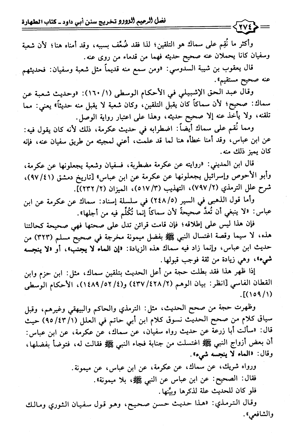 وظهرت حجة من صحح الحديث، مثل: الترمذي والحاكم والبيهقي وغيرهم، وقبل سياق كلام من صحح الحديث نسوق كلام ابن أبي حاتم في العلل (١/ ٤٣/ ٩٥) حيث قال: "سألت أبا زرعة عن حديث رواه سفيان، عن سماك، عن عكرمة، عن ابن عباس: أن بعض أزواج النبي - صلى الله عليه وسلم - اغتسلت من جنابة فجاء النبي - صلى الله عليه وسلم - فقالت له، فتوضأ بفضلها، وقال: "الماء لا ينجسه شيء".