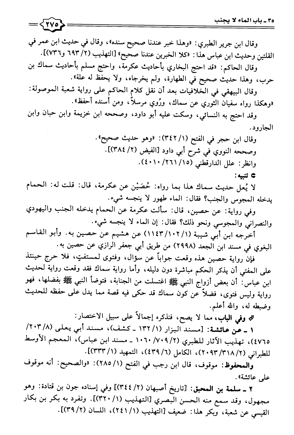 وقال ابن جرير الطبري: "وهذا خبر عندنا صحيح سنده"، وقال في حديث ابن عمر في القلتين وحديث ابن عباس هذا: "كلا الخبرين عندنا صحيح" [التهذيب (٢/ ٦٩٣ و ٧٣٦)].