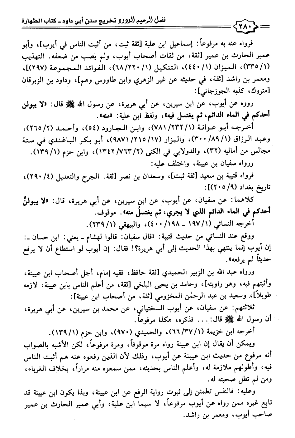 رووه عن أيوب، عن ابن سيرين، عن أبي هريرة، عن رسول الله - صلى الله عليه وسلم - قال: "لا يبولن أحدكم في الماء الدائم، ثم يغتسل فيه"، ولفظ ابن علية: "منه".