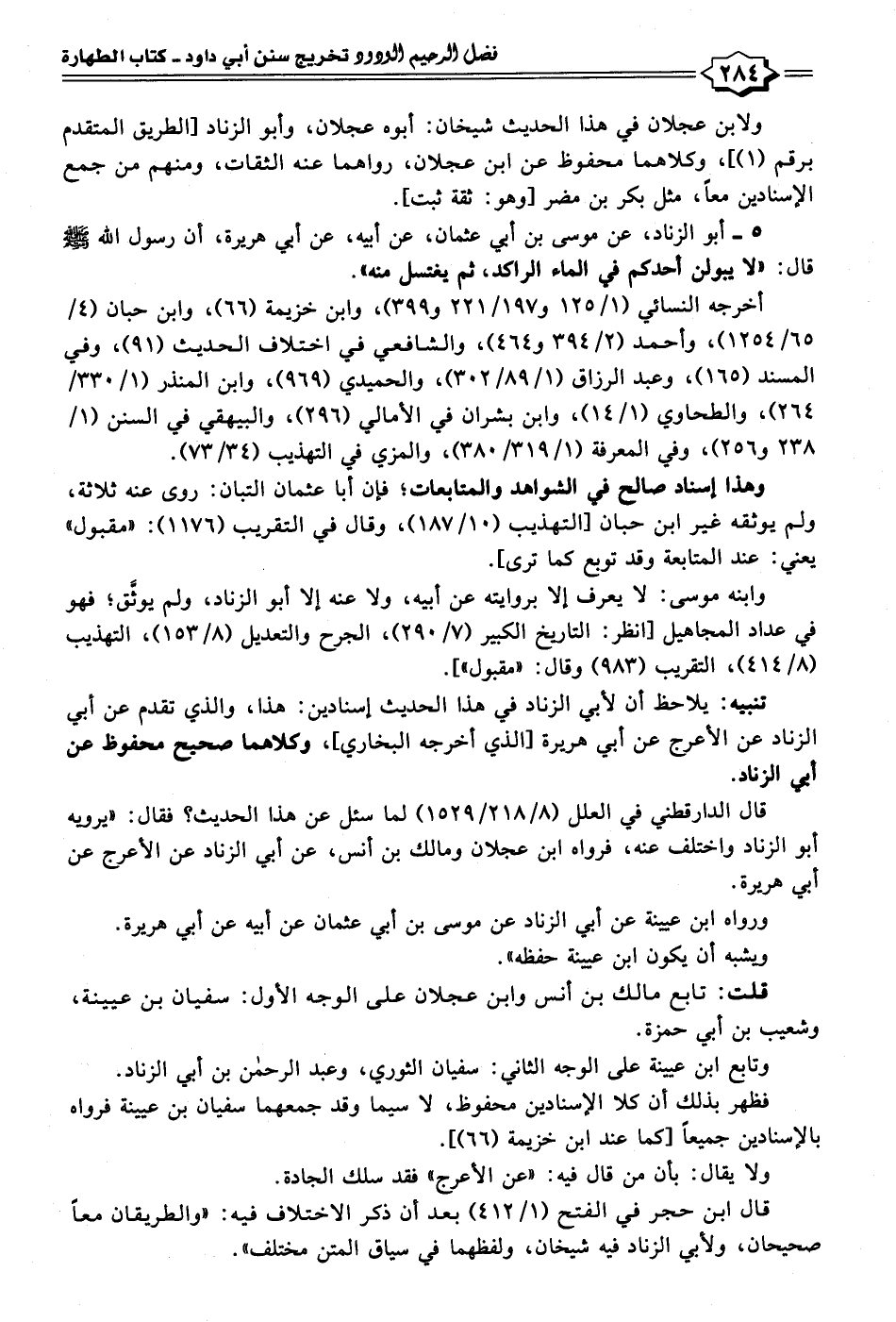 ٥ - أبو الزناد، عن موسى بن أبي عثمان، عن أبيه، عن أبي هريرة، أن رسول الله - صلى الله عليه وسلم - قال: "لا يبولن أحدكم في الماء الراكد، ثم يغتسل منه".