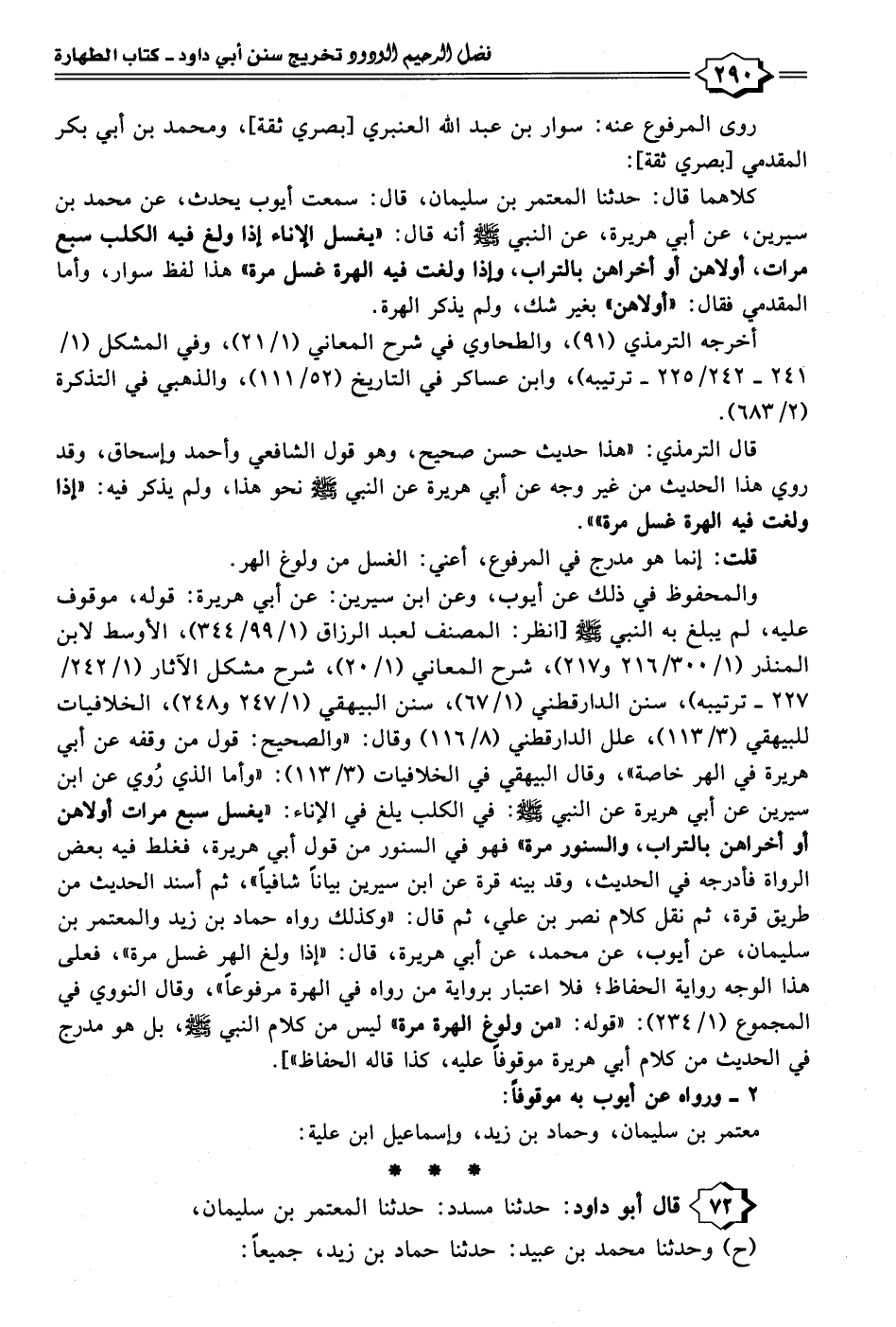 ٧٢ - قال أبو داود: حدثنا مسدد: حدثنا المعتمر بن سليمان، (ح) وحدثنا محمد بن عبيد: حدثنا حماد بن زيد، جميعًا: