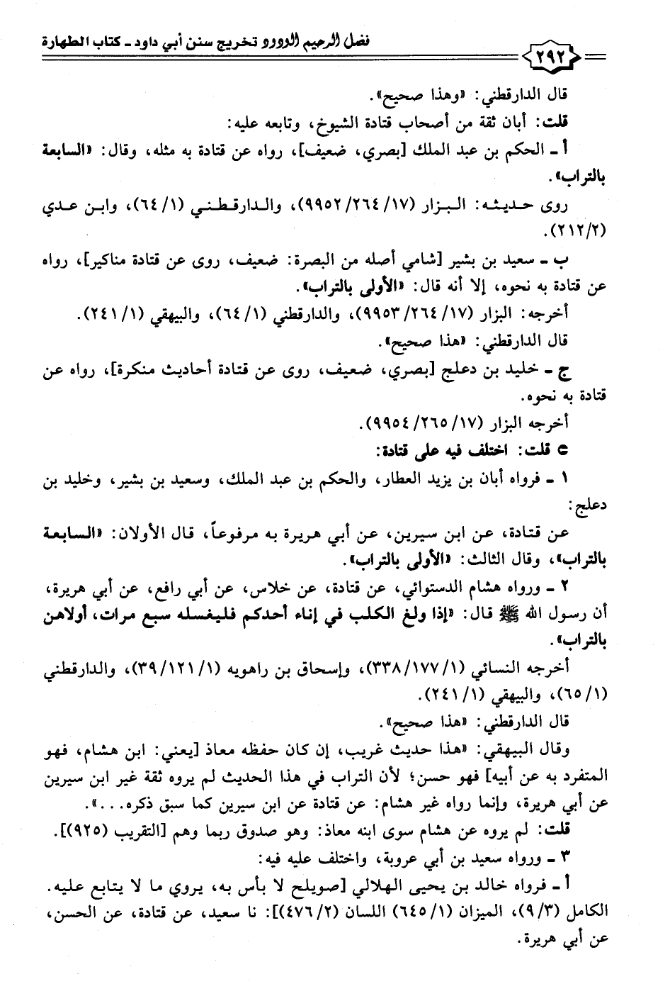 عن قتادة، عن ابن سيرين، عن أبي هريرة به مرفوعًا، قال الأولان: "السابعة بالتراب"، وقال الثالث: "الأولى بالتراب".