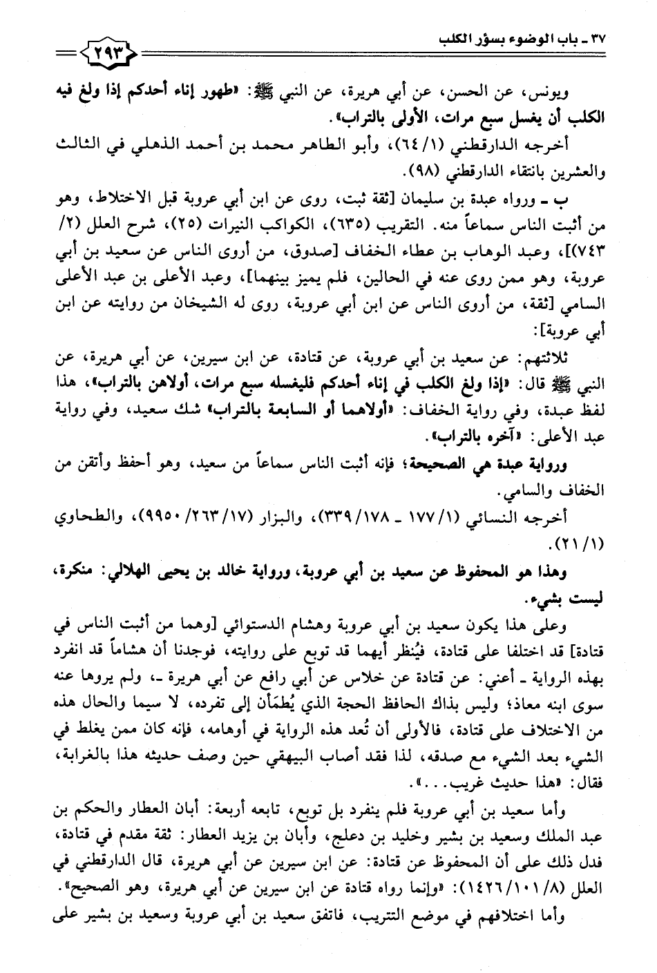 ثلاثتهم: عن سعيد بن أبي عروبة، عن قتادة، عن ابن سيرين، عن أبي هريرة، عن النبي - صلى الله عليه وسلم - قال: "إذا ولغ الكلب في إناء أحدكم فليغسله سبع مرات، أولاهن بالتراب"، هذا لفظ عبدة، وفي رواية الخفاف: "أولاهما أو السابعة بالتراب" شك سعيد، وفي رواية عبد الأعلى: "آخره بالتراب".