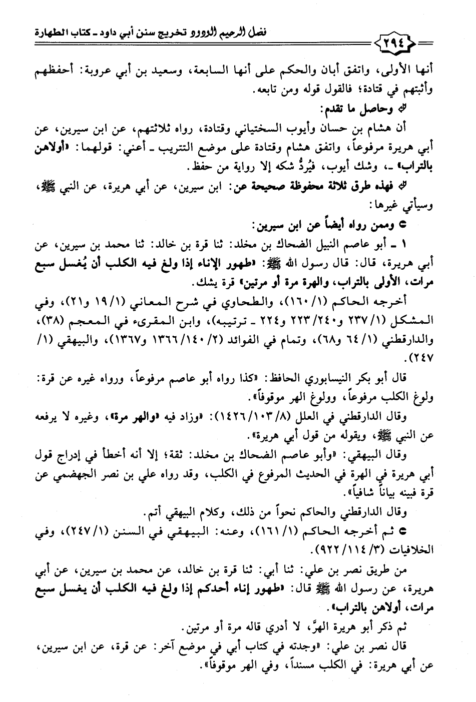 ١ - أبو عاصم النبيل الضحاك بن مخلد: حدثنا قرة بن خالد: حدثنا محمد بن سيرين، عن أبي هريرة، قال: قال رسول الله - صلى الله عليه وسلم -: "طهور الإناء إذا ولغ فيه الكلب أن يُغسل سبع مرات، الأولى بالتراب، والهرة مرة أو مرتين" قرة يشك.