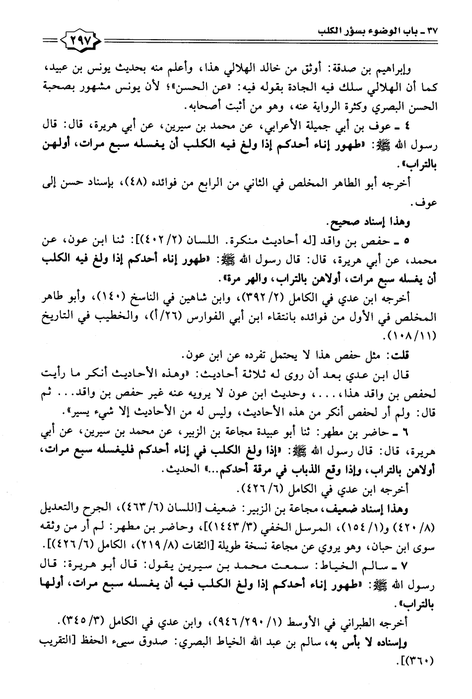 ٧ - سالم الخياط: سمعت محمد بن سيرين يقول: قال أبو هريرة: قال رسول الله - صلى الله عليه وسلم -: "طهور إناء أحدكم إذا ولغ الكلب فيه أن يغسله سبع مرات، أولها بالتراب".