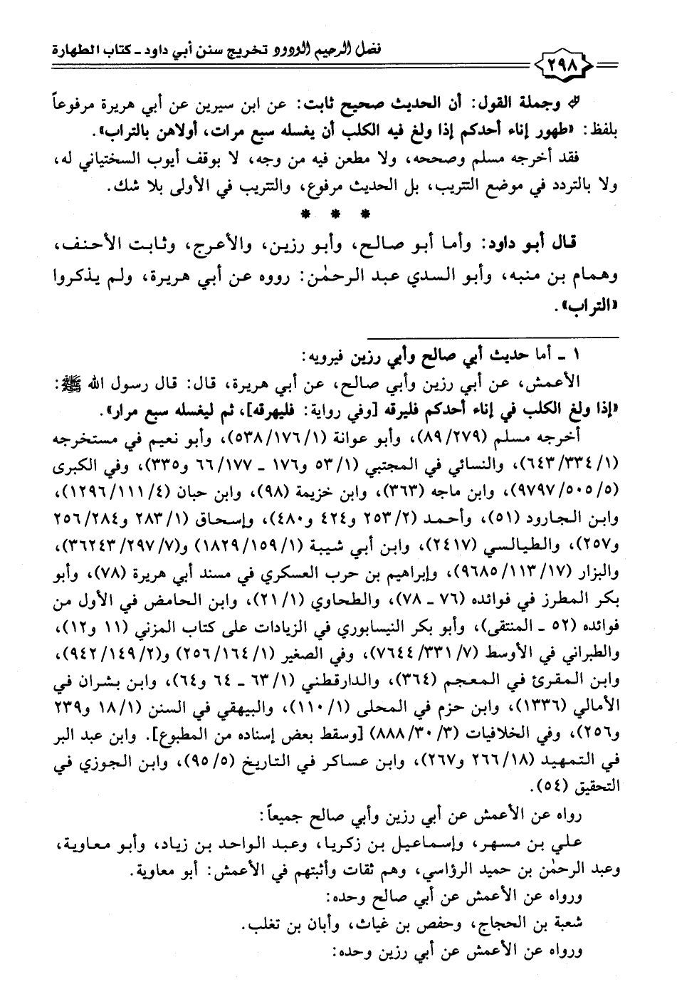 قال أبو داود: وأما أبو صالح، وأبو رزين، والأعرج، وثابت الأحنف، وهمام بن منبه، وأبو السدي عبد الرحمن: رووه عن أبي هريرة، ولم يذكروا "التراب".