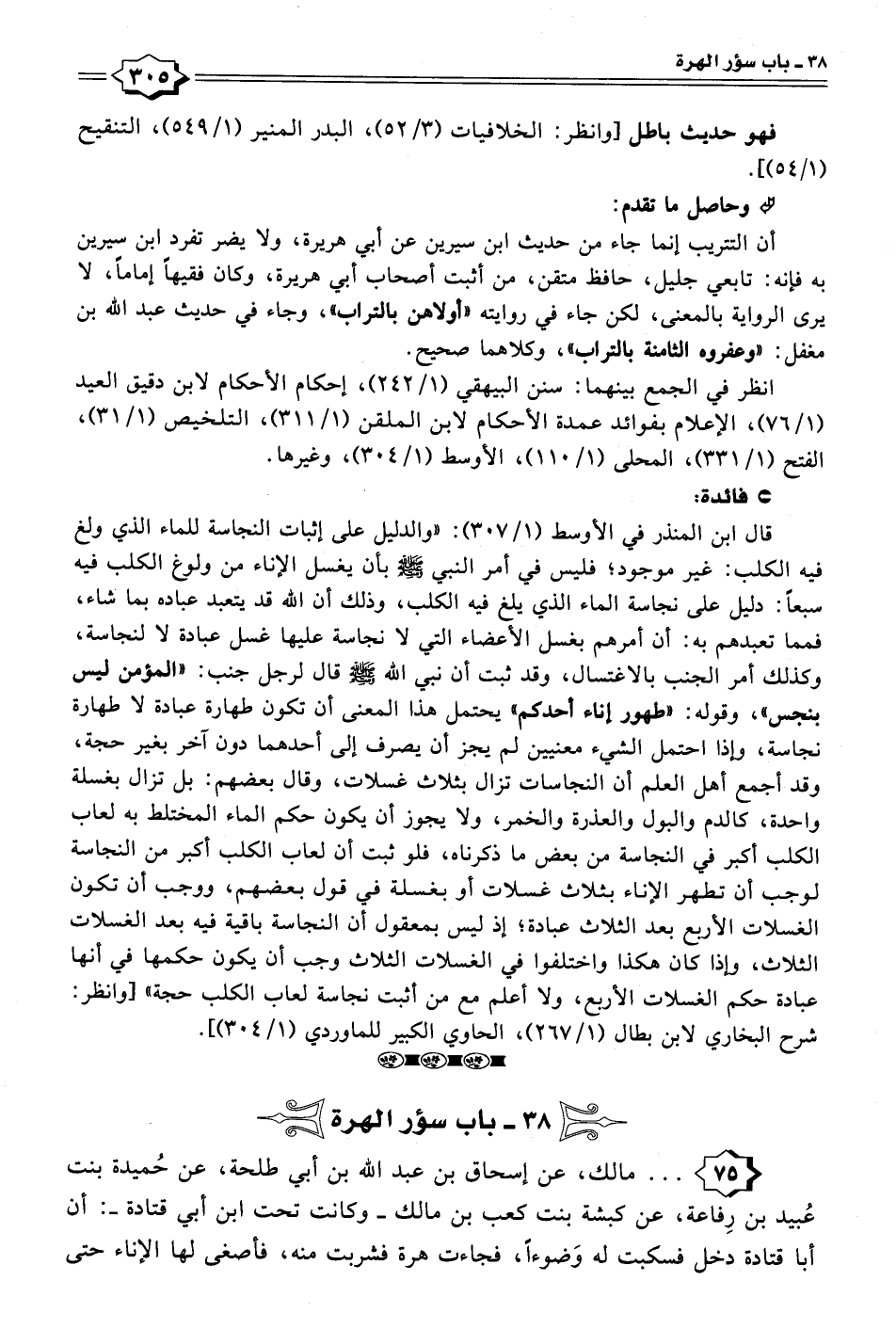 أن التتريب إنما جاء من حديث ابن سيرين عن أبي هريرة، ولا يضر تفرد ابن سيرين به فإنه: تابعي جليل، حافظ متقن، من أثبت أصحاب أبي هريرة، وبيان فقيهًا إمامًا، لا يرى الرواية بالمعنى، لكن جاء في روايته "أولاهن بالتراب"، وجاء في حديث عبد الله بن مغفل: "وعفروه الثامنة بالتراب"، وكلاهما صحيح.