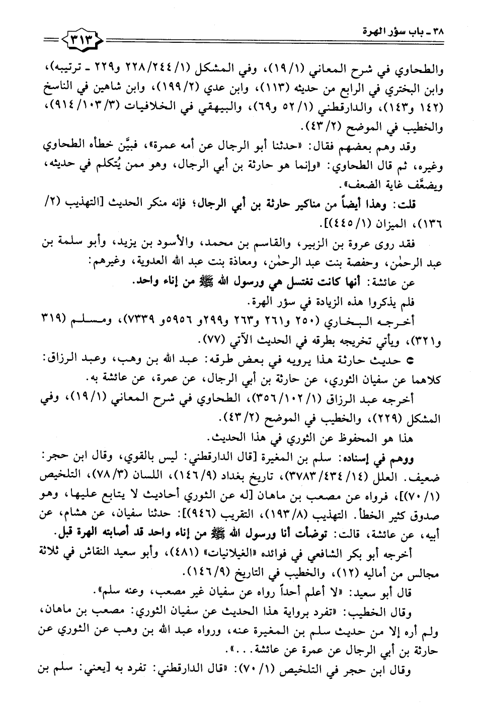 وقال الخطيب: "تفرد برواية هذا الحديث عن سفيان الثوري: مصعب بن ماهان، ولم أره إلا من حديث سلم بن المغيرة عنه، ورواه عبد الله بن وهب عن الثوري عن حارثة بن أبي الرجال عن عمرة عن عائشة ... ".
