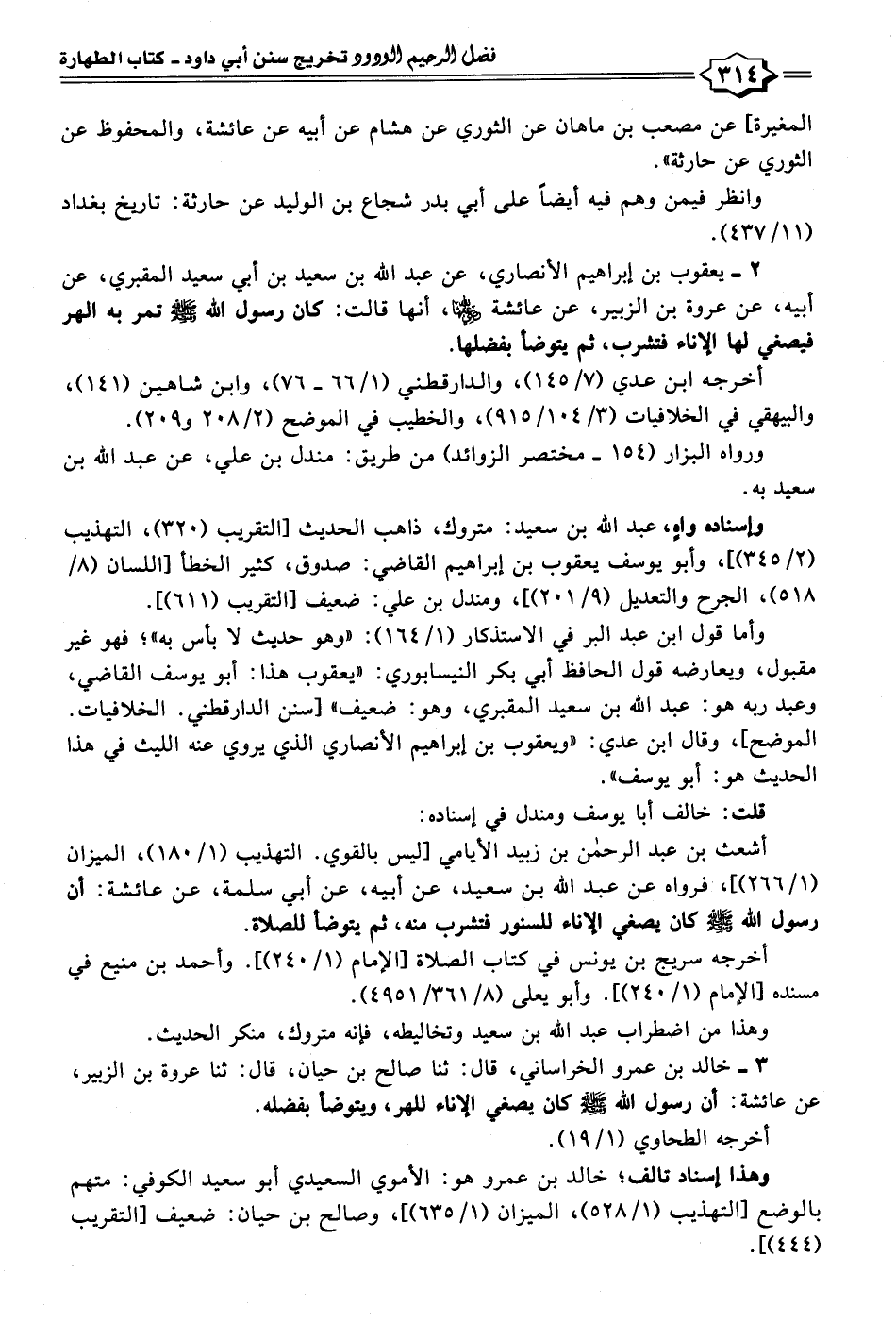 ٢ - يعقوب بن إبراهيم الأنصاري، عن عبد الله بن سعيد بن أبي سعيد المقبري، عن أبيه، عن عروة بن الزبير، عن عائشة - رضي الله عنها -، أنها قالت: كان رسول الله - صلى الله عليه وسلم - تمر به الهر فيصغي لها الإناء فتشرب، ثم يتوضأ بفضلها.