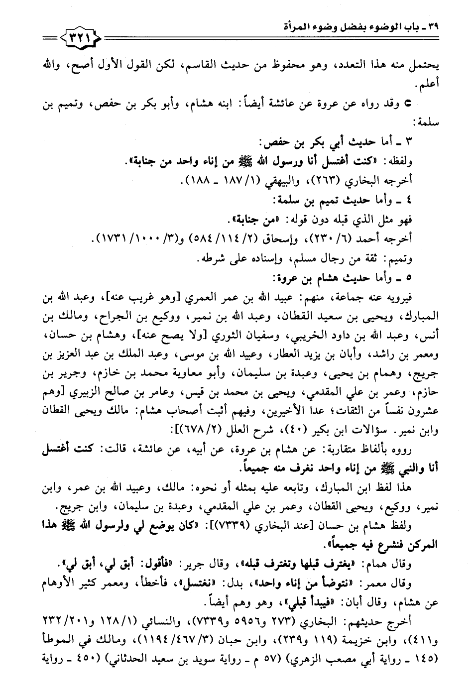رووه بألفاظ متقاربة: عن هشام بن عروة، عن أبيه، عن عائشة، قالت: كنت أغتسل أنا والنبي - صلى الله عليه وسلم - من إناء واحد نغرف منه جميعًا.