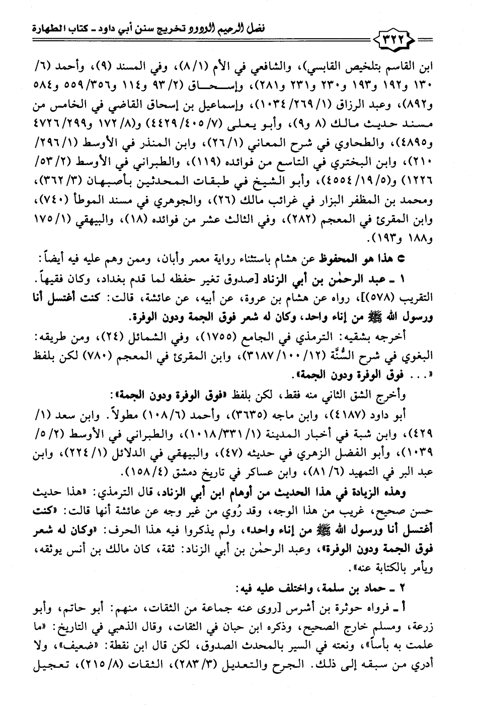 ١ - عبد الرحمن بن أبي الزناد [صدوق تغير حفظه لما قدم بغداد، وكان فقيهًا. التقريب (٥٧٨)]، رواه عن هشام بن عروة، عن أبيه، عن عائشة، قالت: كنت أغتسل أنا ورسول الله - صلى الله عليه وسلم - من إناء واحد، وكان له شعر فوق الجمة ودون الوفرة.