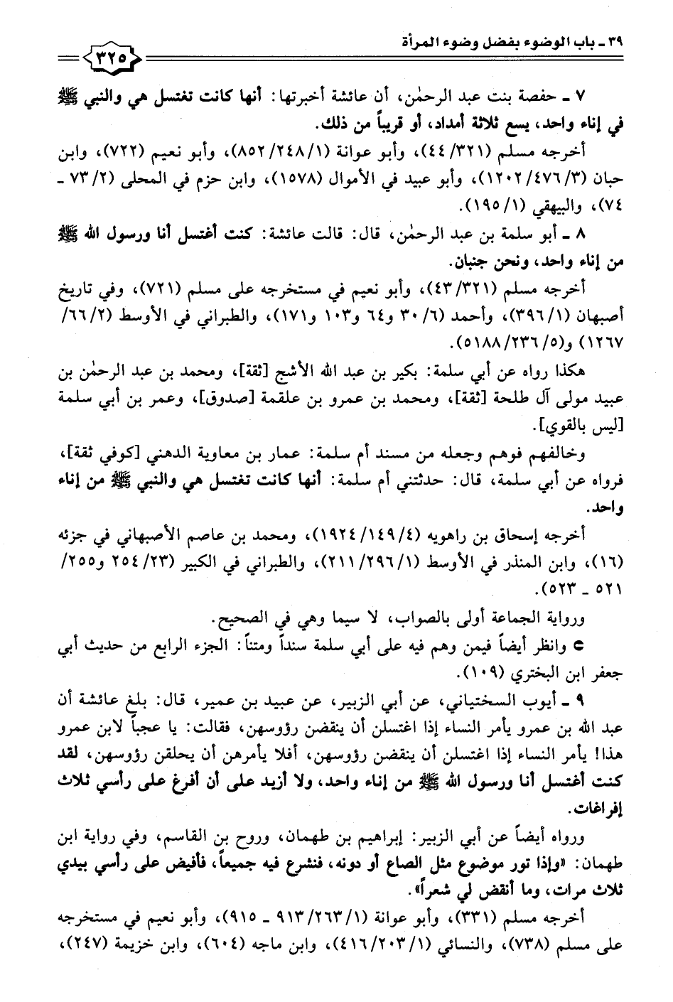 ٨ - أبو سلمة بن عبد الرحمن، قال: قالت عائشة: كنت أغتسل أنا ورسول الله - صلى الله عليه وسلم - من إناء واحد، ونحن جنبان.
