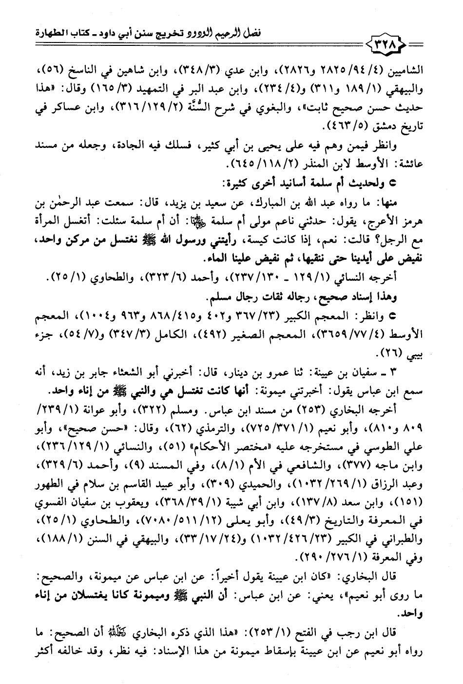 منها: ما رواه عبد الله بن المبارك، عن سعيد بن يزيد، قال: سمعت عبد الرحمن بن هرمز الأعرج، يقول: حدثني ناعم مولى أم سلمة - رضي الله عنهما -: أن أم سلمة سئلت: أتغسل المرأة مع الرجل؟ قالت: نعم، إذا كانت كيسة، رأيتني ورسول الله - صلى الله عليه وسلم - نغتسل من مركن واحد، نفيض على أيدينا حتى ننقيها، ثم نفيض علينا الماء.