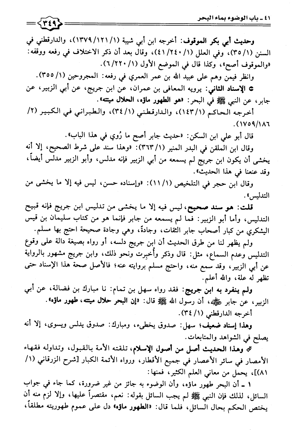 ١ - أن البحر طهور ماؤه، وأن الوضوء به جائز من غير ضرورة، كما جاء في جواب السائل، لذلك فإن النبي - صلى الله عليه وسلم - لم يجب السائل بقوله: نعم، مقتصرًا عليها، وإلا لزم منه أن يختص الحكم بحال السائل، فلما قال: "الطهور ماؤه" دل على عموم طهوريته مطلقًا،