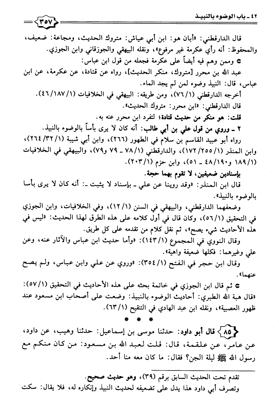 • ثم قال ابن الجوزي في خاتمة بحثه على هذه الأحاديث في التحقيق (١/ ٥٧): "قال هبة الله الطبري: أحاديث الوضوء بالنبيذ: وضعت على أصحاب ابن مسعود عند ظهور العصبية"، ونقله ابن عبد الهادي في التنقيح (١/ ٦٣).
