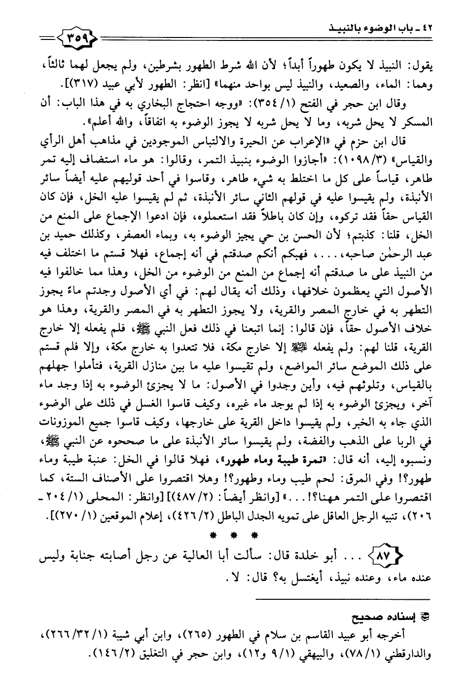 ٨٧ - . . . أبو خلدة قال: سألت أبا العالية عن رجل أصابته جنابة وليس عنده ماء، وعنده نبيذ، أيغتسل به؟ قال: لا.
