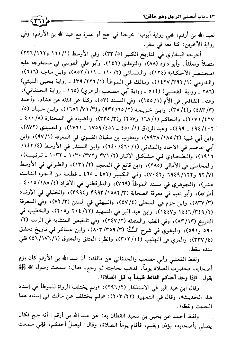 ولفظ القعنبي وأبي مصعب والحدثاني عن مالك: أن عبد الله بن الأرقم كان يؤم أصحابه، فحضرت الصلاة يومًا، فذهب لحاجته ثم رجع، فقال: سمعت رسول الله - صلى الله عليه وسلم - يقول: "إذا وجد أحدكم الغائط فليبدأ به قبل الصلاة".