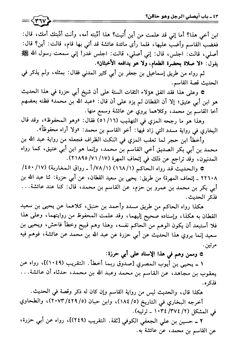 • وعلى هذا فقد اتفق هؤلاء الثقات الستة على أن شيخ أبي حزرة في هذا الحديث هو ابن أبي عتيق؛ إلا أن القطان لم يزد على أن قال: "عبد اللَّه بن محمد" فظنه بعضهم أخا القاسم بن محمد، وكلاهما يروي عن عائشة وسمع منها.