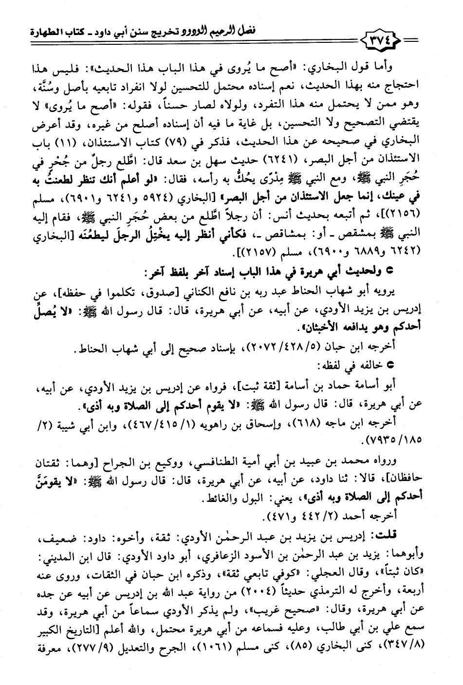 أبو أسامة حماد بن أسامة [ثقة ثبت]، فرواه عن إدريس بن يزيد الأودي، عن أبيه، عن أبي هريرة، قال: قال رسول الله - صلى الله عليه وسلم -: "لا يقوم أحدكم إلى الصلاة وبه أذى".