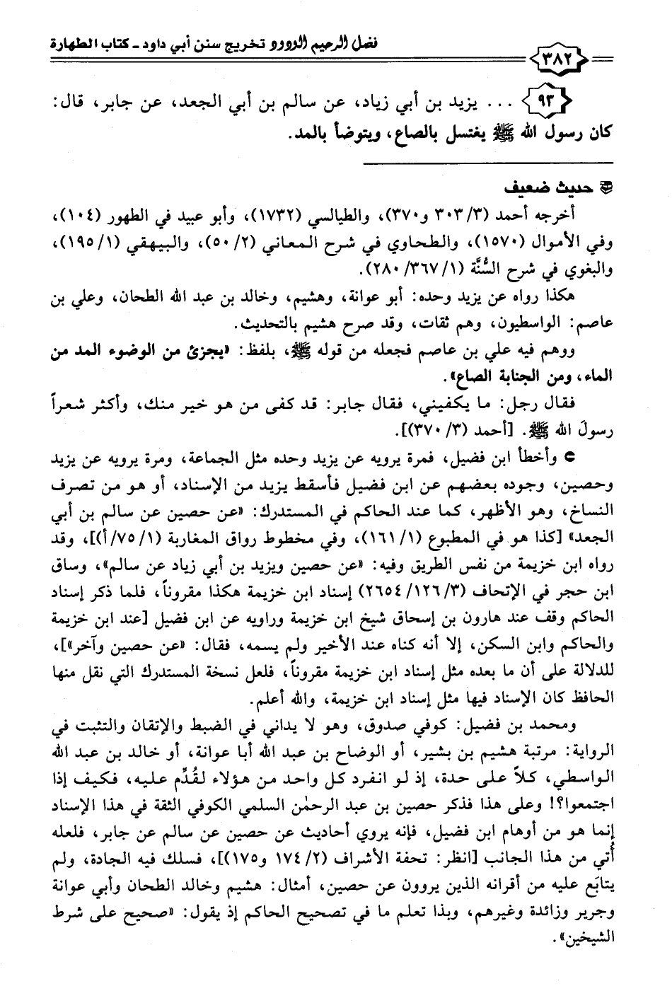 ٩٣ - . . . يزيد بن أبي زياد، عن سالم بن أبي الجعد، عن جابر، قال: كان رسول الله - صلى الله عليه وسلم - يغتسل بالصاع، ويتوضأ بالمد.