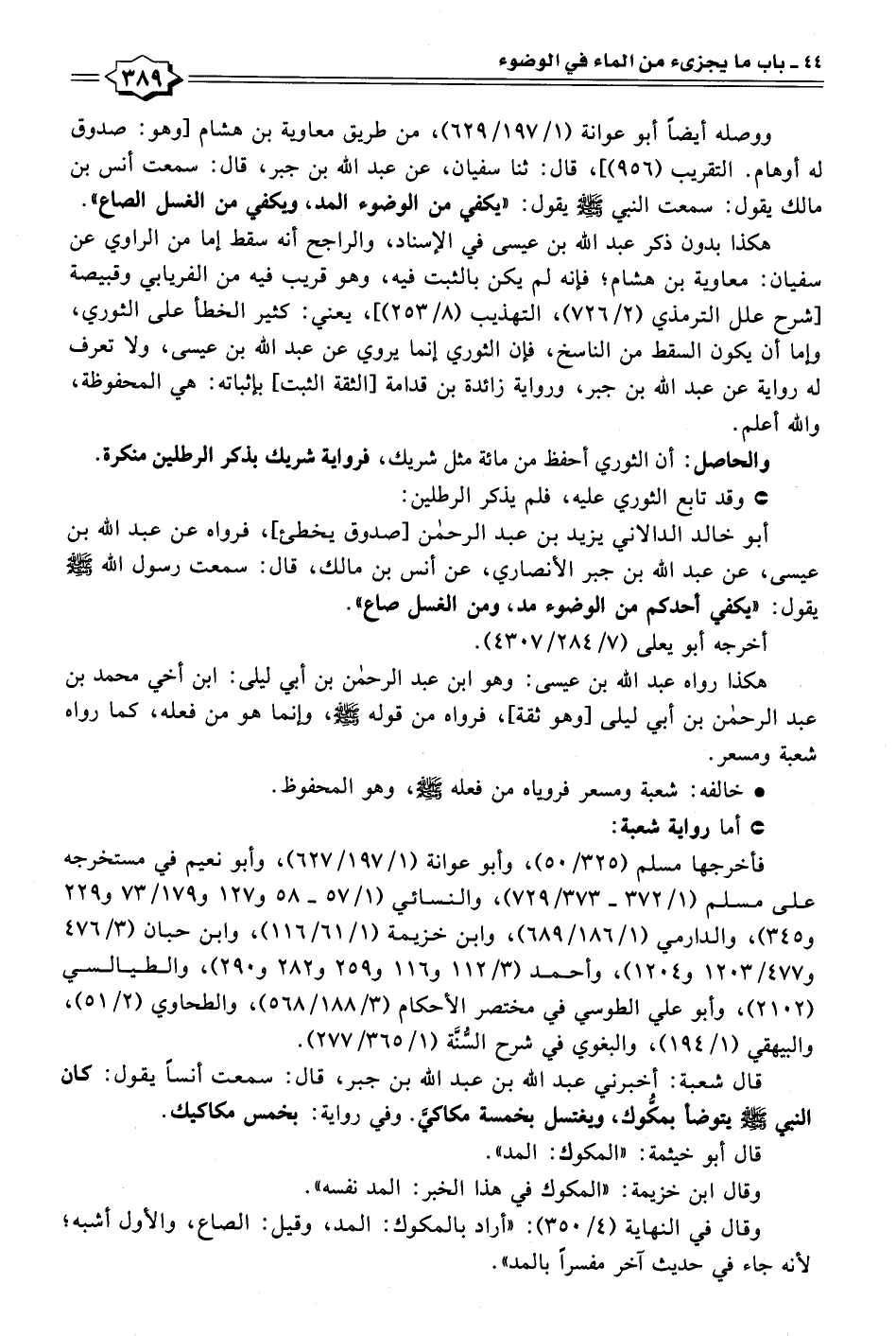 قال شعبة: أخبرني عبد الله بن عبد الله بن جبر، قال: سمعت أنسًا يقول: كان النبي - صلى الله عليه وسلم - يتوضأ بمكوك، ويغتسل بخمسة مكاكيَّ. وفي رواية: بخمس مكاكيك.
