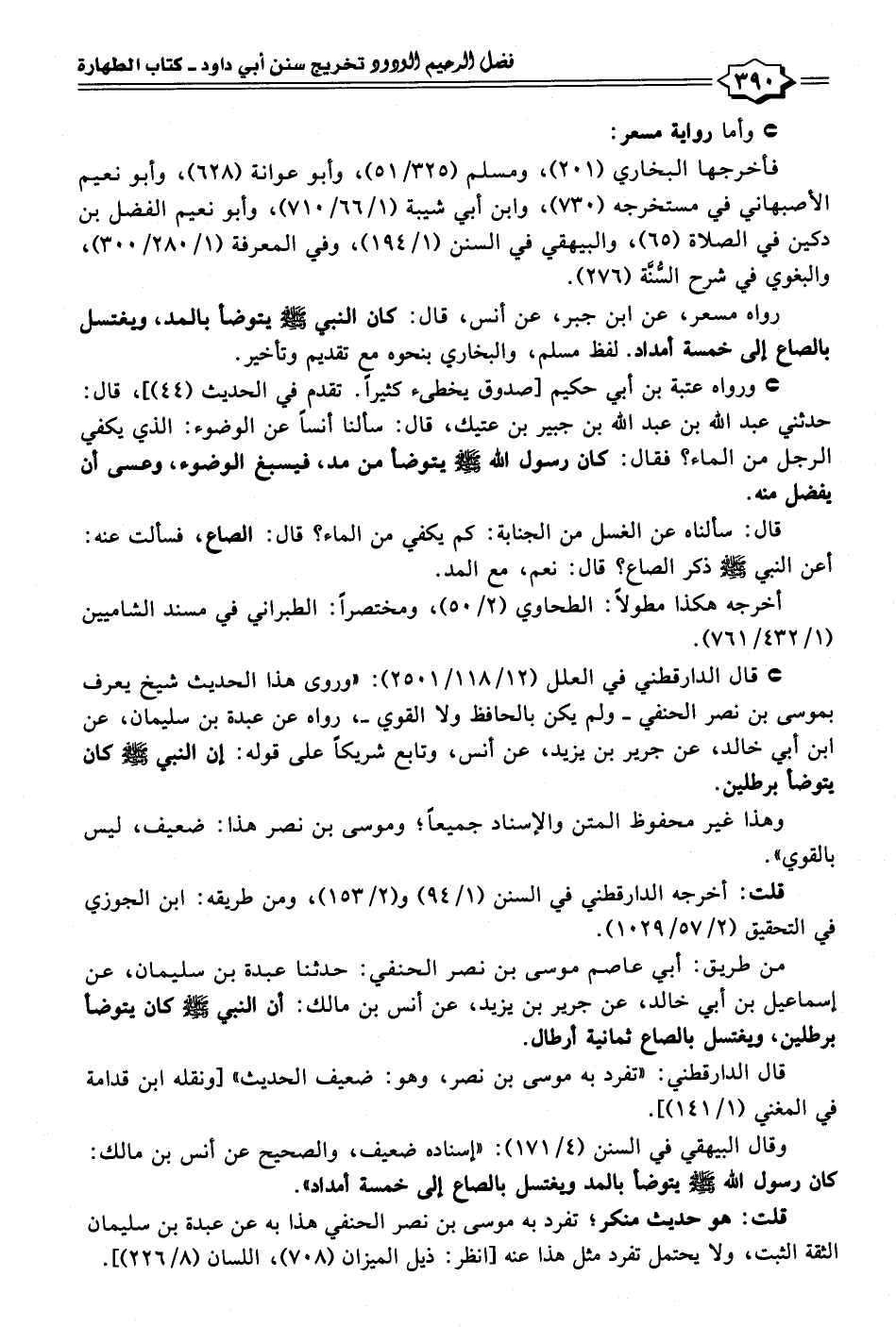 رواه مسعر، عن ابن جبر، عن أنس، قال: كان النبي - صلى الله عليه وسلم - يتوضأ بالمد، ويغتسل بالصاع إلى خمسة أمداد. لفظ مسلم، والبخاري بنحوه مع تقديم وتأخير.