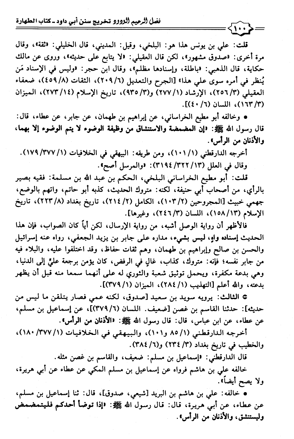 • خالفه: علي بن هاشم بن البريد [شيعي، صدوق]، قال: ثنا إسماعيل بن مسلم، عن عطاء، عن أبي هريرة، قال: قال رسول الله - صلى الله عليه وسلم -: "إذا توضأ أحدكم فليتمضمض وليستنشق، والأذنان من الرأس".