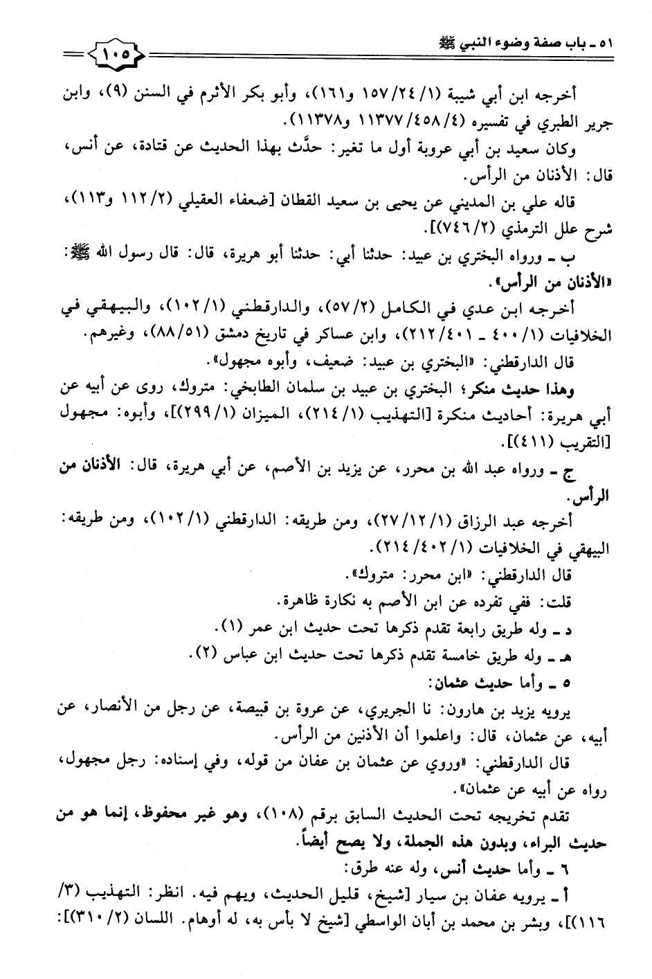 ب- ورواه البختري بن عبيد: حدثنا أبي: حدثنا أبو هريرة، قال: قال رسول الله - صلى الله عليه وسلم -: "الأذنان من الرأس".