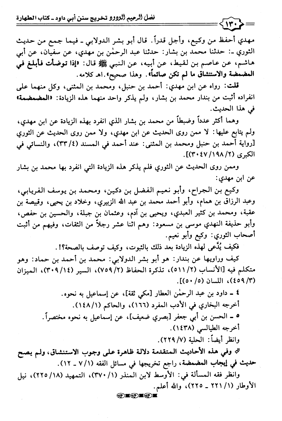مهدي أحفظ من وكيع، وأجل قدرًا. قال أبو بشر الدولابي -فيما جمع من حديث الثوري-: حدثنا محمد بن بشار: حدثنا عبد الرحمن بن مهدي، عن سفيان، عن أبي هاشم، عن عاصم بن لقيط، عن أبيه، عن النبي - صلى الله عليه وسلم - قال: "إذا توضأت فأبلغ في المضمضة والاستنشاق ما لم تكن صائمًا". وهذا صحيح". ا هـ كلامه.