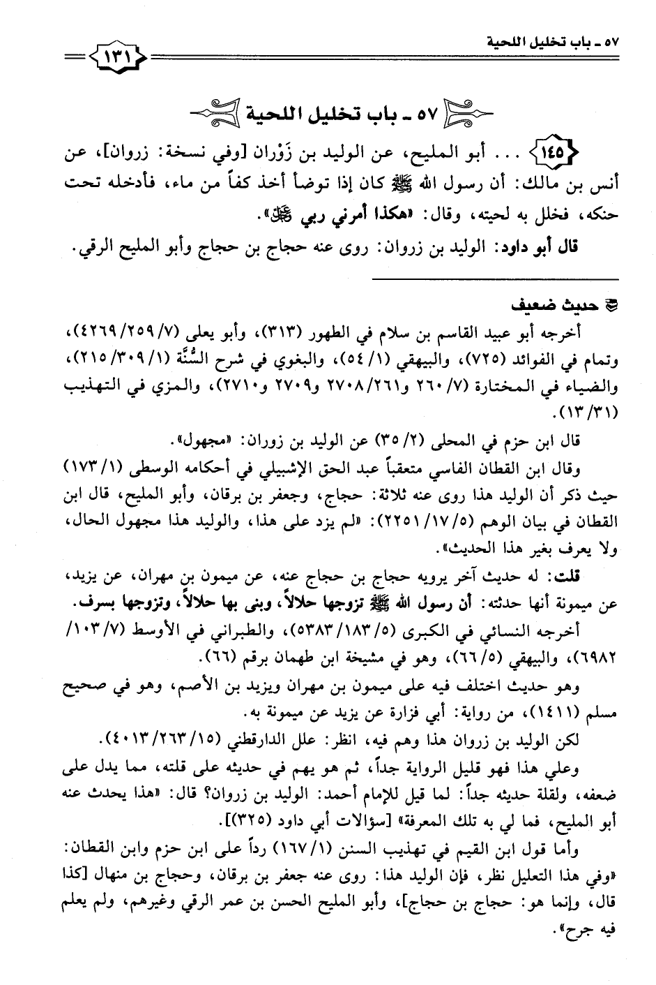 ١٤٥ - . . . أبو المليح، عن الوليد بن زَوْران [وفي نسخة: زروان]، عن أنس بن مالك: أن رسول الله - صلى الله عليه وسلم - كان إذا توضأ أخذ كفًا من ماء، فأدخله تحت حنكه، فخلل به لحيته، وقال: "هكذا أمرني ربي عز وجل".