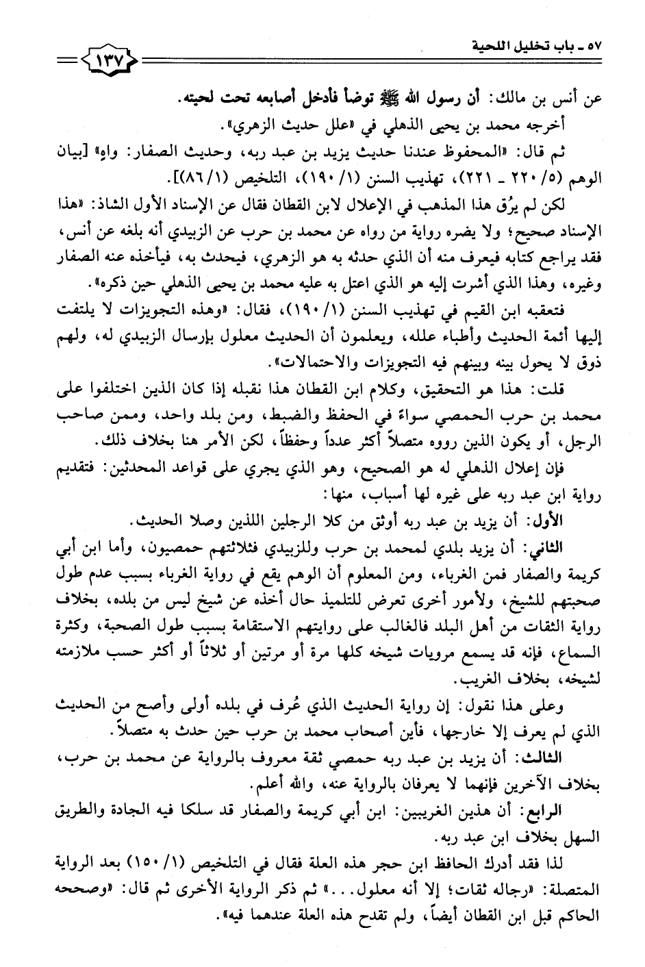 لكن لم يرُق هذا المذهب في الإعلال لابن القطان فقال عن الإسناد الأول الشاذ: "هذا الإسناد صحيح؛ ولا يضره رواية من رواه عن محمد بن حرب عن الزبيدي أنه بلغه عن أنس، فقد يراجع كتابه فيعرف منه أن الذي حدثه به هو الزهري، فيحدث به، فيأخذه عنه الصفار وغيره، وهذا الذي أشرت إليه هو الذي اعتل به عليه محمد بن يحيى الذهلي حين ذكره".