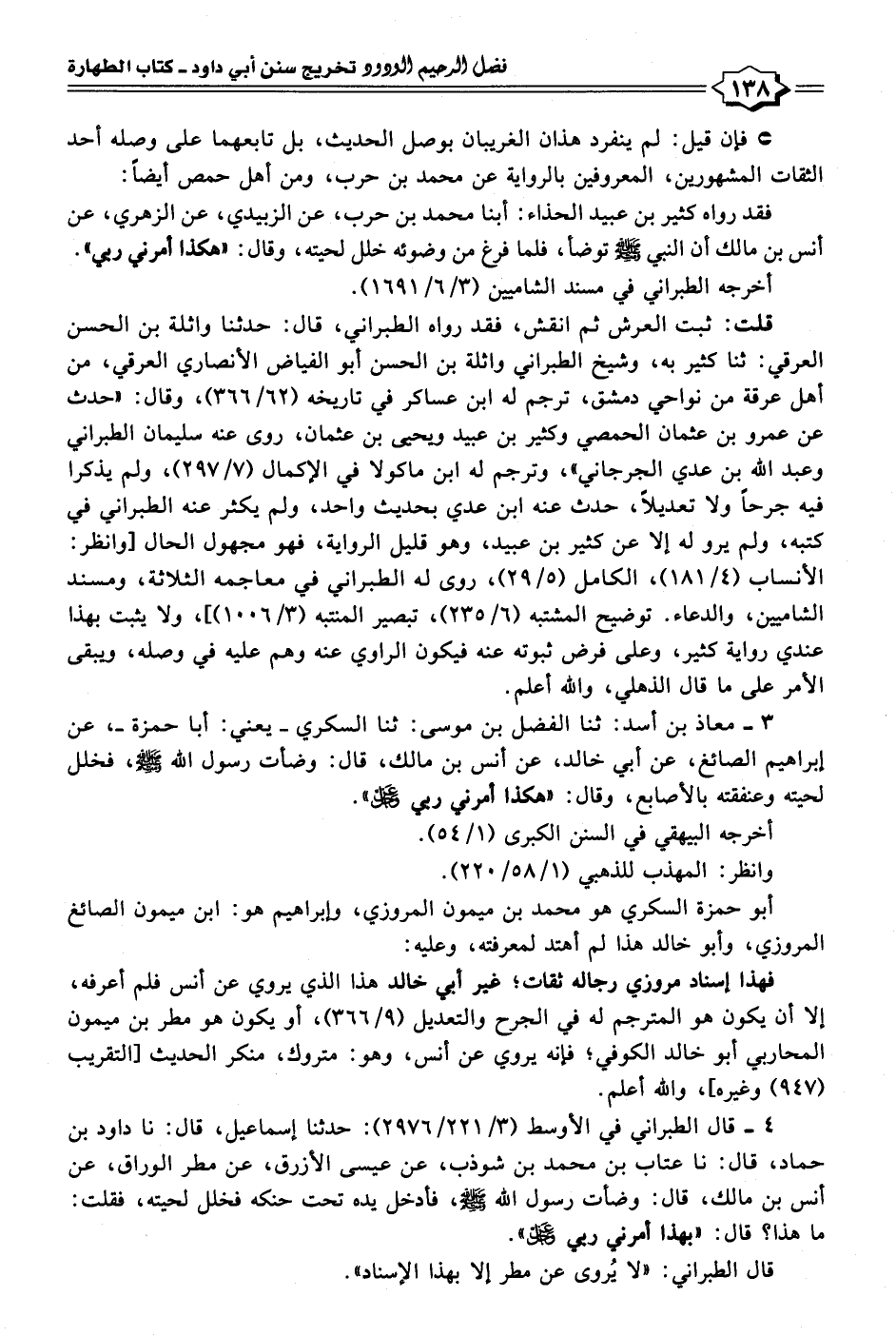 ٣ - معاذ بن أسد: ثنا الفضل بن موسى: ثنا السكري -يعني: أبا حمزة-، عن إبراهيم الصائغ، عن أبي خالد، عن أنس بن مالك، قال: وضأت رسول الله - صلى الله عليه وسلم -، فخلل لحيته وعنفقته بالأصابع، وقال: "هكذا أمرني ربي عز وجل.