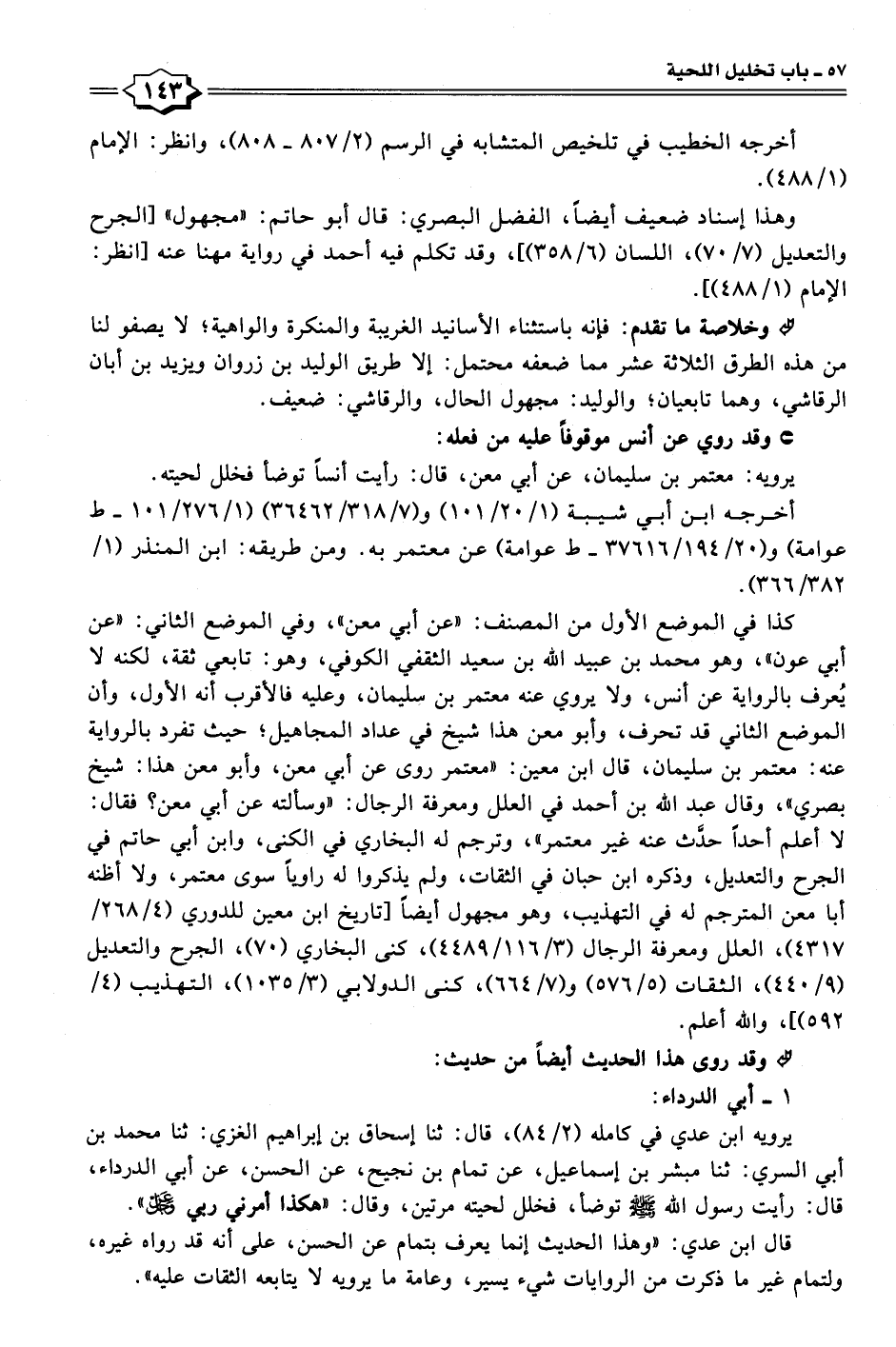 يرويه ابن عدي في كامله (٢/ ٨٤)، قال: ثنا إسحاق بن إبراهيم الغزي: ثنا محمد بن أبي السري: ثنا مبشر بن إسماعيل، عن تمام بن نجيح، عن الحسن، عن أبي الدرداء، قال: رأيت رسول الله - صلى الله عليه وسلم - توضأ، فخلل لحيته مرتين، وقال: "هكذا أمرني ربي عز وجل".