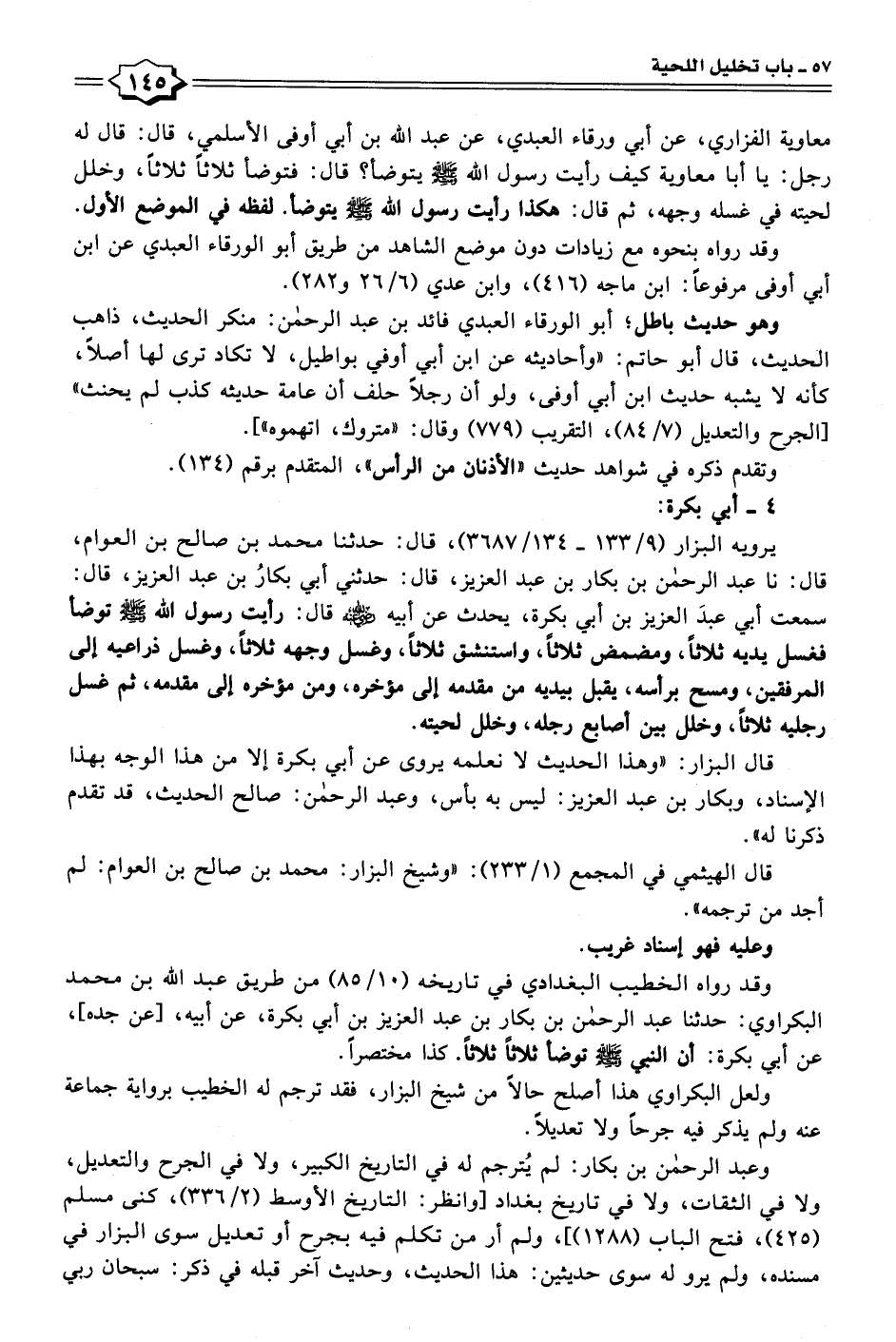 معاوية الفزاري، عن أبي ورقاء العبدي، عن عبد الله بن أبي أوفى الأسلمي، قال: قال له رجل: يا أبا معاوية كيف رأيت رسول الله - صلى الله عليه وسلم - يتوضأ؟ قال: فتوضا ثلاثًا ثلاثًا، وخلل لحيته في غسله وجهه، ثم قال: هكذا رأيت رسول الله - صلى الله عليه وسلم - يتوضأ. لفظه في الموضع الأول.