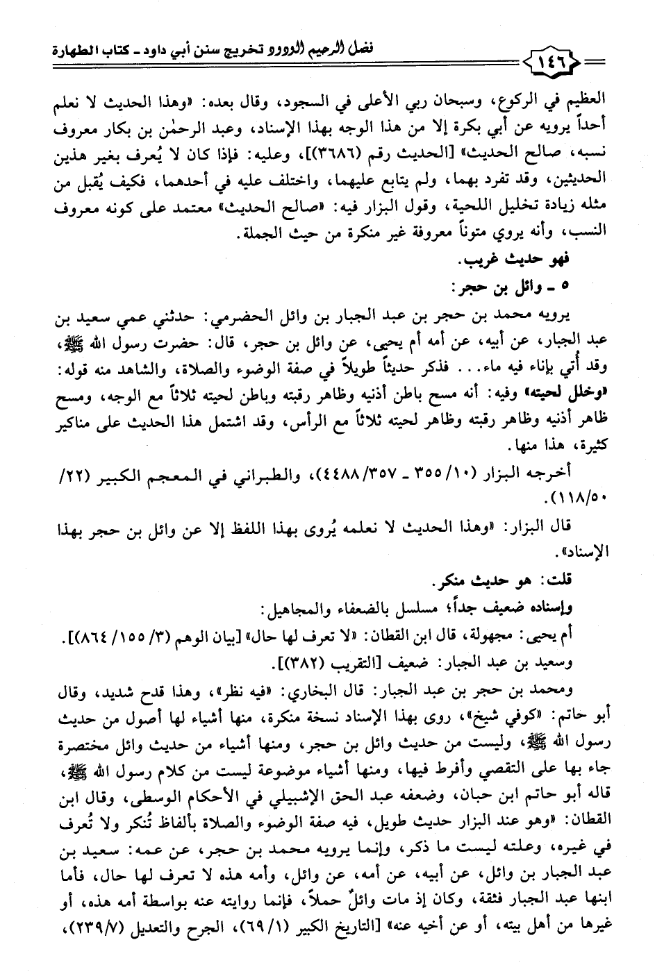 ومحمد بن حجر بن عبد الجبار: قال البخاري: "فيه نظر"، وهذا قدح شديد، وقال أبو حاتم: "كوفي شيخ"، روى بهذا الإسناد نسخة منكرة، منها أشياء لها أصول من حديث رسول الله - صلى الله عليه وسلم -، وليست من حديث وائل بن حجر، ومنها أشياء من حديث وائل مختصرة جاء بها على التقصي وأفرط فيها، ومنها أشياء موضوعة ليست من كلام رسول الله - صلى الله عليه وسلم -، قاله أبو حاتم ابن حبان، وضعفه عبد الحق الإشبيلي في الأحكام الوسطى، وقال ابن القطان: "وهو عند البزار حديث طويل، فيه صفة الوضوء والصلاة بألفاظ تُنكر ولا تُعرف في غيره، وعلته ليست ما ذكر، وإنما يرويه محمد بن حجر، عن عمه: سعيد بن عبد الجبار بن وائل، عن أبيه، عن أمه، عن وائل، وأمه هذه لا تعرف لها حال، فأما ابنها عبد الجبار فثقة، وكان إذ مات وائل حملًا، فإنما روايته عنه بواسطة أمه هذه، أو غيرها من أهل بيته، أو عن أخيه عنه" [التاريخ الكبير (١/ ٦٩)، الجرح والتعديل (٧/ ٢٣٩)،